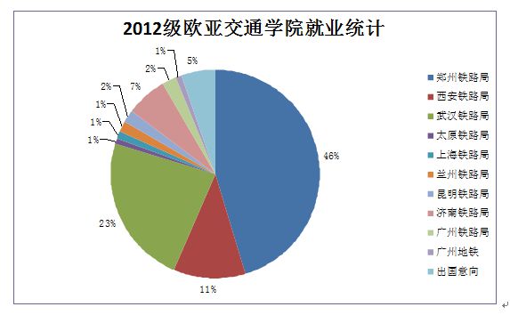 我校欧亚交通学院2012级开设5个铁道类专业,共595名学生,截止目前,郑州铁路局、武汉铁路局、西安铁路局、济南铁路局等多家用人单位共招收我院学生411名,其中铁道机车车辆专业136人,城市轨道交通运营管理专业163人,电气化铁道技术37人,铁道通信信号39人,铁道工程技术12人。继2010级、2011级学生之后,2012级学生持续提前一年实现了高质量就业。四年来,欧亚交通学院做为我校中俄合作办学机构,已有34人赴俄圣彼得堡国立交通大学留学,其中2010级24人,2011级10人,其他学生均到各大铁路局就业,就业率达到97%以上。
