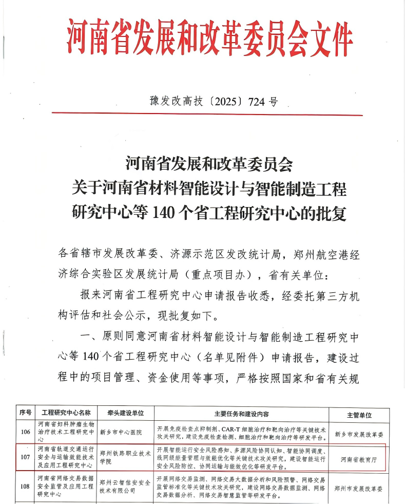 近日,河南省发展和改革委员会发布了《关于河南省材料智能设计与智能制造工程研究中心等140个省工程研究中心的批复》(豫发改高技〔2025〕724号)文件,由我校运输管理学院牵头申报的“河南省轨道交通运行安全与运输效能工程研究中心”成功获批河南省工程研究中心。