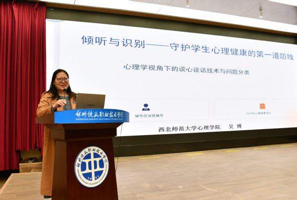 学校制订了《郑州铁路职业技术学院2025年心理健康教育宣传周实施方案》,进一步明确工作要求。积极组织全校1万余名师生收看“2025年全省高校心理健康教育宣传周活动启动仪式暨心理情景剧展演”,并在全校举办开幕仪式,对本次活动周的意义进行了深刻阐述,系统布局、有效协同,为后续活动的顺利开展奠定了良好基础。启幕仪式后,西北师范大学吴博教授针对全体学工人员开展了“倾听与识别——守护学生心理健康的第一道防线”心理健康专题培训,帮助学工人员掌握积极倾听、共情回应、开放提问、摘要澄清四个关键技术,在倾听中捕捉潜在心理需求、识别潜在心理问题,提升专业技能。