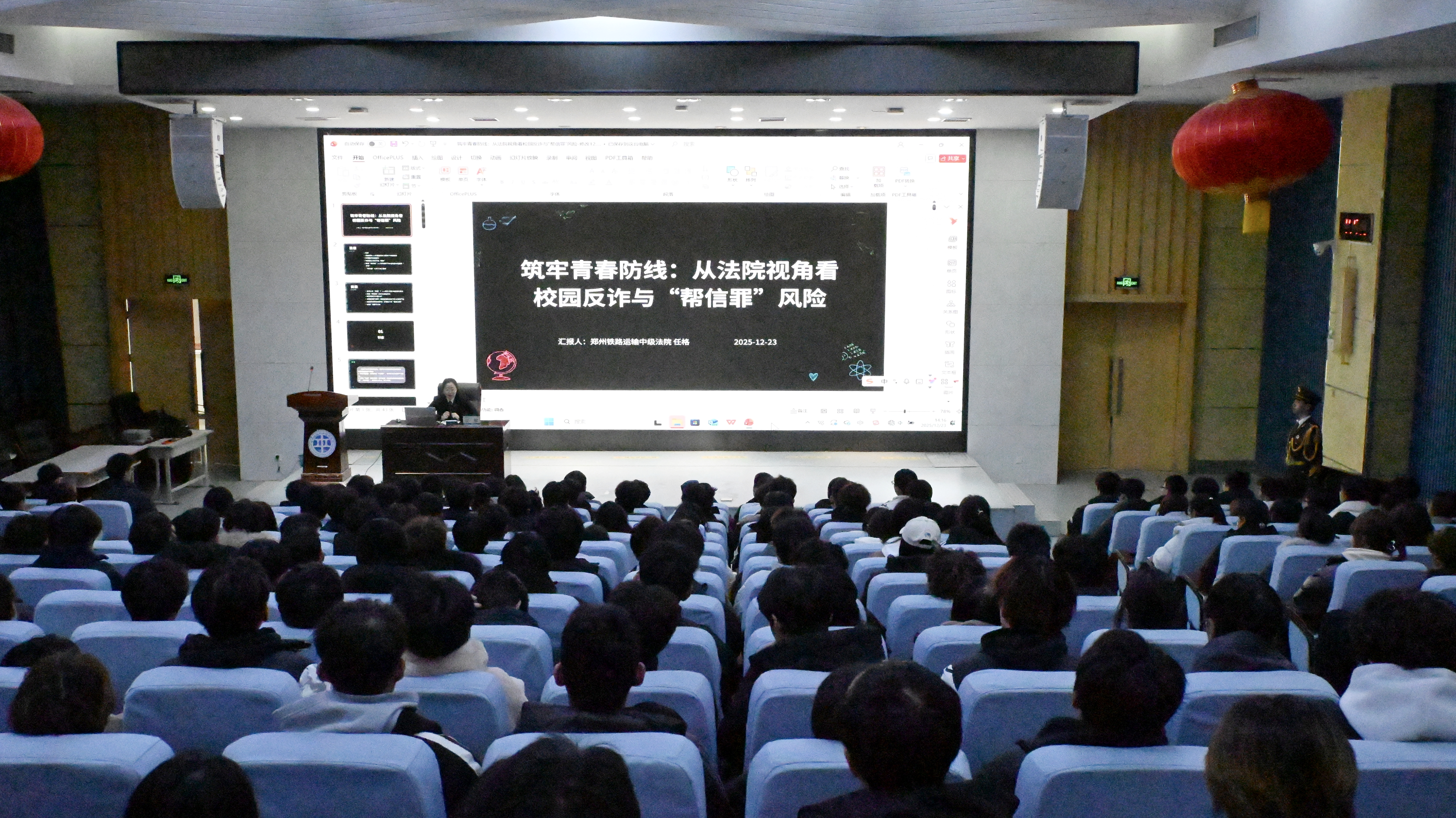 为有效提高广大学生的反诈骗意识和防范能力,营造安全、和谐的校园环境。12月23日,学校邀请郑州铁路运输中级法院一级法官任格,在第二报告厅作题为“筑牢青春防线:从法院视角看校园反诈与‘帮信罪’风险”的防范诈骗专项普法教育报告。副校长梁明亮出席报告会,并与来校参加报告会的铁路运输中级法院的4位同志进行交流。党委保卫部有关人员及300余名学生参加报告会。