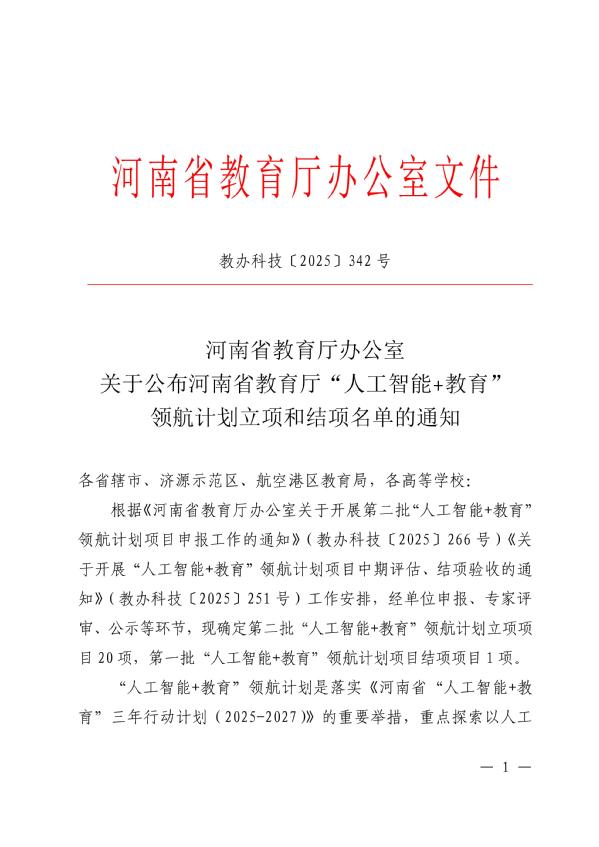 近日,河南省教育厅办公室发布了《关于公布河南省教育厅“人工智能+教育”领航计划立项和结项名单的通知》,我校信息化办公室与人工智能学院联合申报的“基于三层解耦架构的 AI 智能教学平台构建与应用”成功入选第二批“人工智能+教育”领航计划项目立项名单,彰显了我校在人工智能技术与教育教学融合应用领域的扎实基础与突出实力。