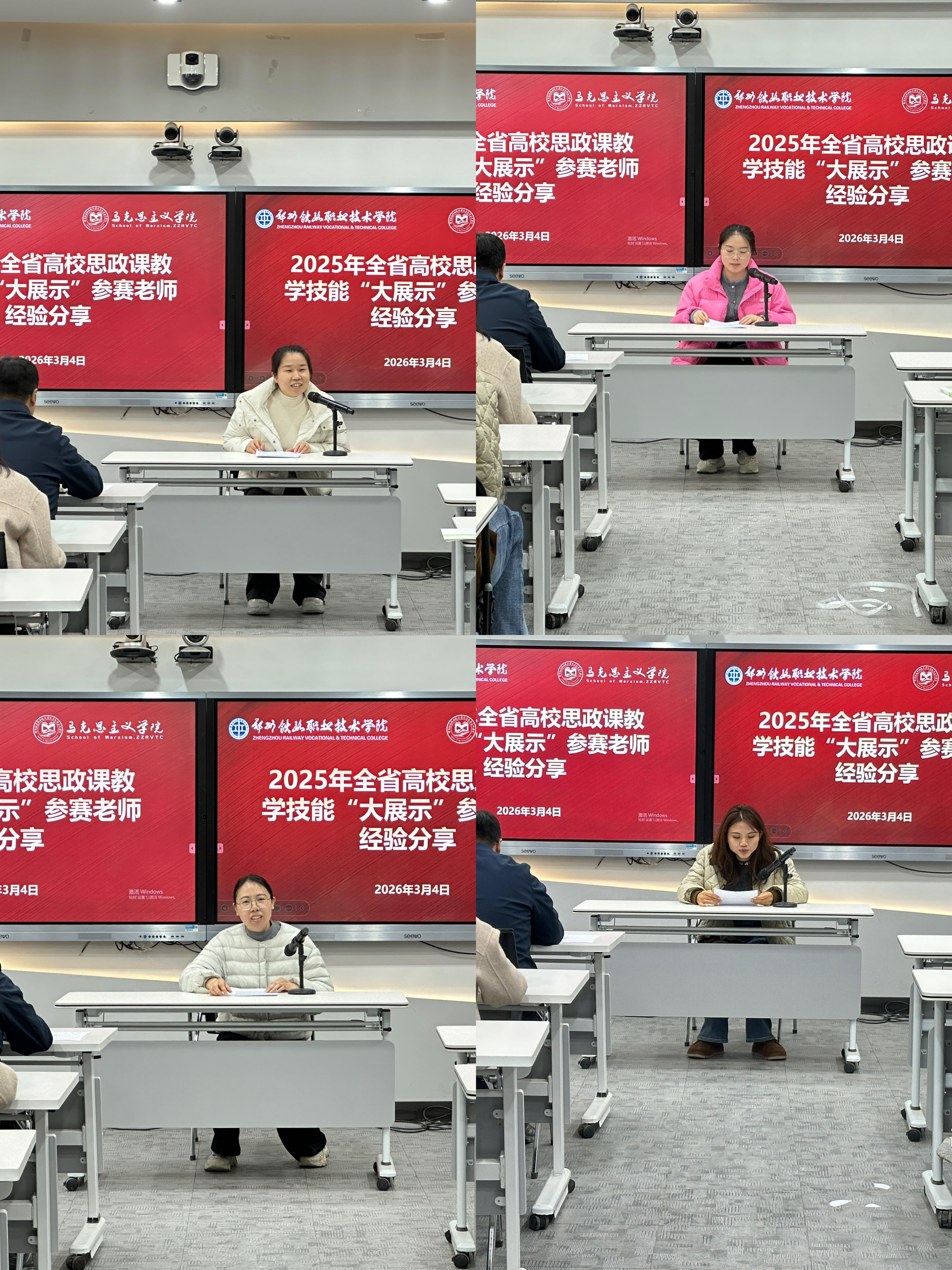 为深化思政课教学改革,提升教师教学能力,3月4日,马克思主义学院组织开展教学技能“大展示”活动,邀请2025年全省思政课教学技能“大比武”获奖教师代表进行经验分享。侯彬彬、王雨、申艳婷、张泽欣四位教师结合自身参赛经历,从备赛思路、实操技巧、材料撰写等方面分享了宝贵经验。