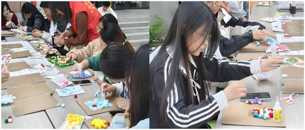 活动现场分设两大体验区,各具特色,氛围浓厚,吸引了学子们的广泛参与。在毛球画DIY区域,各类工具材料整齐陈列,同学们围坐桌前,充分发挥想象力与创造力,将青春的审美与灵感倾注于指尖。五彩绒球经过组合拼贴,化作一幅幅充满心意与巧思的作品,展现出学子们的热情与艺术潜能。