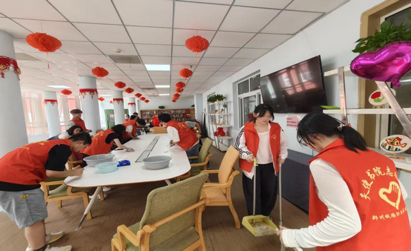 4月18日上午,青年志愿者们满怀热情抵达河南省老年公寓。在工作人员的指导与配合下,志愿者们迅速分工协作,对活动区域进行全面清扫与温馨布置,营造出窗明几净、温暖舒适的活动环境。随后,志愿者们主动走近老年朋友身边,或蹲身问候,或侧耳倾听,在与长者的亲切交流中,同学们不仅聆听了许多珍贵的人生故事,更深刻体会到耐心倾听本身就是一种温暖的传递。对于行动不便的老人,志愿者们始终陪伴左右,细心搀扶,于细微之处展现青春的温度。
