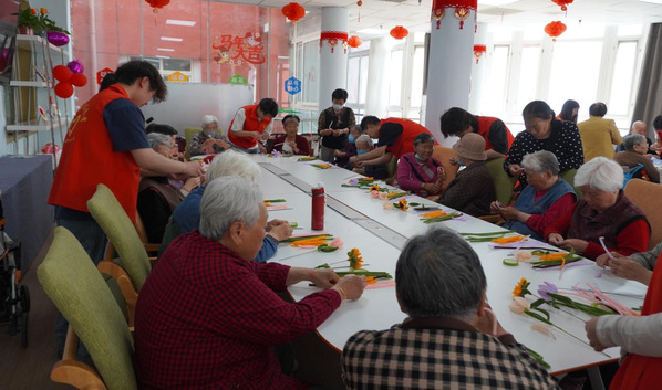 手工制作环节成为连接两代人的温馨时刻。志愿者们手把手教授老人制作扭扭棒花艺。从基础的弯折技巧到整体造型设计,每个步骤都充满耐心的互动。看着老人们从略显生疏到逐渐熟练,再到最终创作出一朵朵栩栩如生的向日葵与郁金香,志愿者们的成就感与感动油然而生。参与活动的学生感慨道:“帮助爷爷奶奶完成手工花的过程,让我深深体会到,真正的陪伴不仅需要爱心,更需要耐心与智慧。”