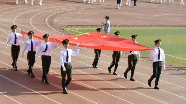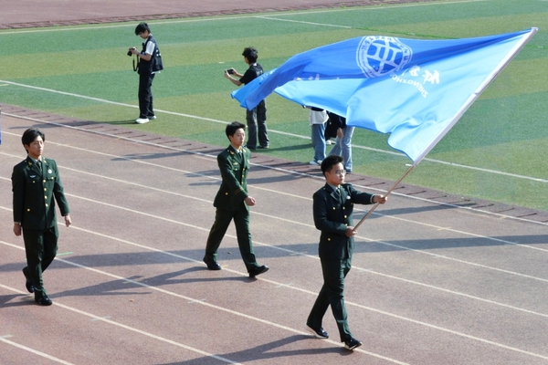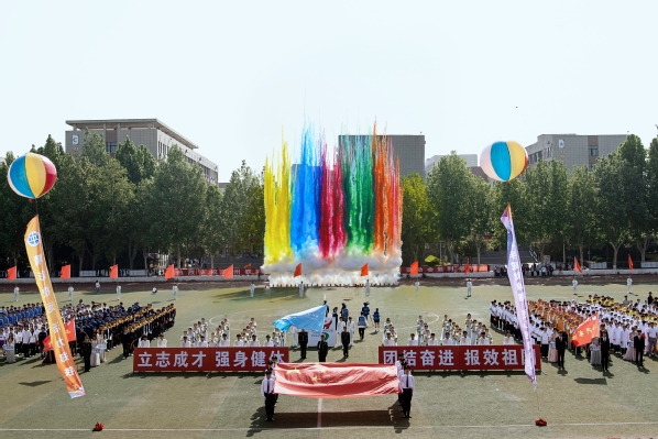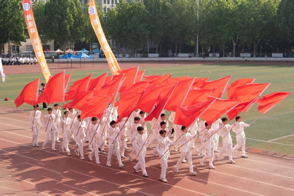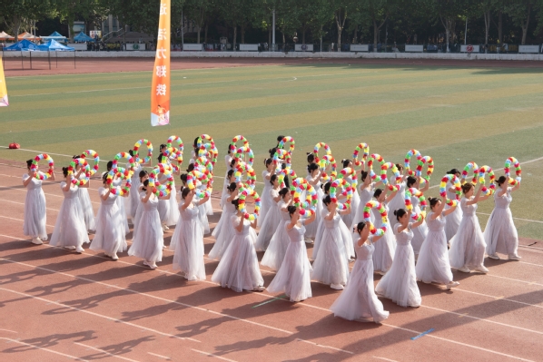 开幕式后,大型团体操震撼表演。600名学生手握彩带、挥动彩旗,伴随着动感的音乐变换队形,运动赛场上洋溢着蓬勃向上、勇于拼搏的青春气息。