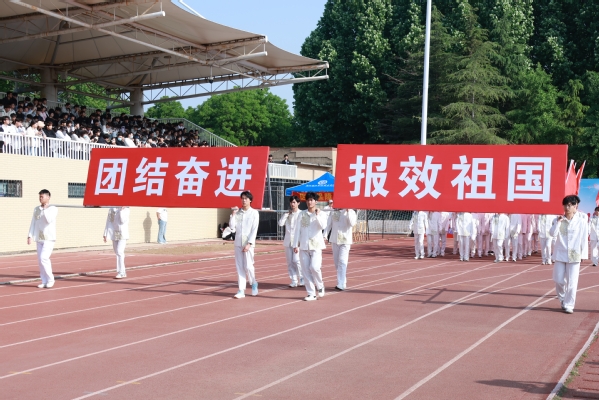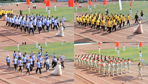 伴随着雄壮激昂的《运动员进行曲》,国旗、校旗、会徽、标语、红旗、花环6个特色方阵率先迈入场内。紧随其后的是16支“书院+学院”融合的学生方阵与教工代表队,他们迈着整齐的步伐依次进入运动场。学生们以充满青春活力的创意队形,生动展现了学科特色、书院文化与体育精神的深度融合。66余名教职工手持鲜艳旗帜,步伐整齐有力,与现场师生热情互动、挥手致意。铁院师生昂扬向上的精神面貌,赢得了现场阵阵欢呼与热烈掌声。