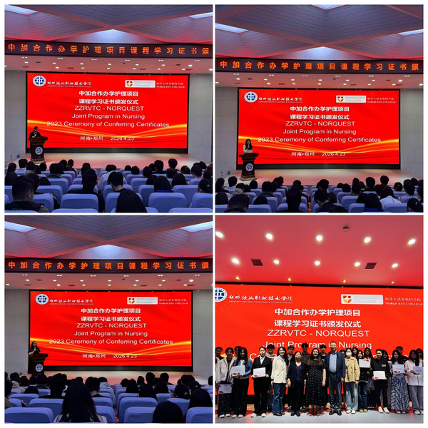 4月23日,中加合作办学护理项目课程学习证书颁发仪式在第二报告厅举行。护理学院院长黄贺梅发表开场致辞,全面回顾了中加合作办学以来的合作成果,对加拿大诺奎斯特学院的支持与配合表示感谢,同时希望同学们能主动对接国际护理标准,不断提升自我,努力成长为兼具国际视野与扎实专业素养的高技能护理人才,在护理事业的广阔天地中实现自己的人生价值!