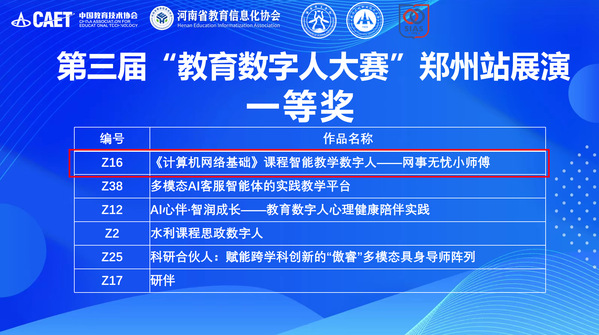 4月27日,第三届“教育数字人大赛”郑州站赛事圆满落幕。我校信息化办公室选送的作品《<计算机网络基础>课程智能教学数字人——网事无忧小师傅》,凭借扎实的技术应用与鲜明的教学价值,在众多参赛作品中脱颖而出,成功荣获一等奖。