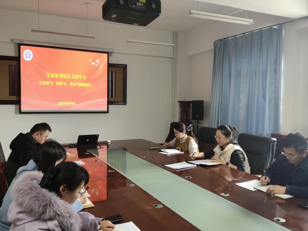 3月6日,发展规划处全体党员干部开展专题学习,深入研读习近平总书记《让愿担当、敢担当、善担当蔚然成风》重要文章,夯实以担当精神锚定学校 “十五五” 规划编制、创建本科层次职业技术大学工作的思想共识与行动根基。