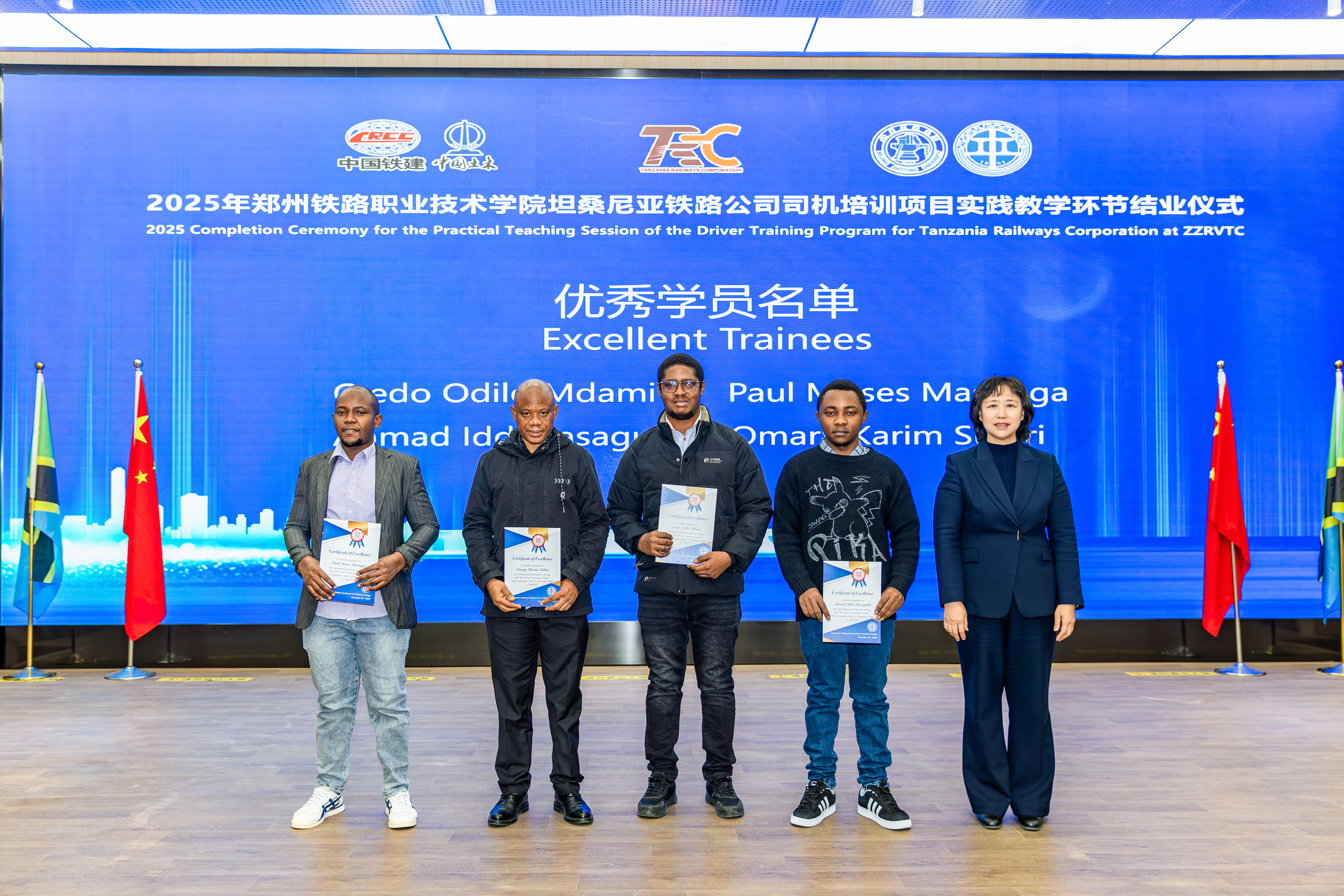 陆艳琦向圆满完成学业的全体坦桑尼亚学员表示热烈祝贺。她指出,此次培训是我校服务“一带一路”倡议、深化中坦两国在轨道交通领域人才培养合作的重要成果。培训期间,学校与中国铁路郑州局集团有限公司紧密协作,为学员量身定制系统化培训方案,全面提升了学员的专业素养与实践能力。她勉励全体学员将所学知识与技能运用到今后的工作中,为提升坦桑尼亚铁路运输安全和运行效率贡献力量,努力成为传承中坦友谊、促进两国合作的坚实桥梁。