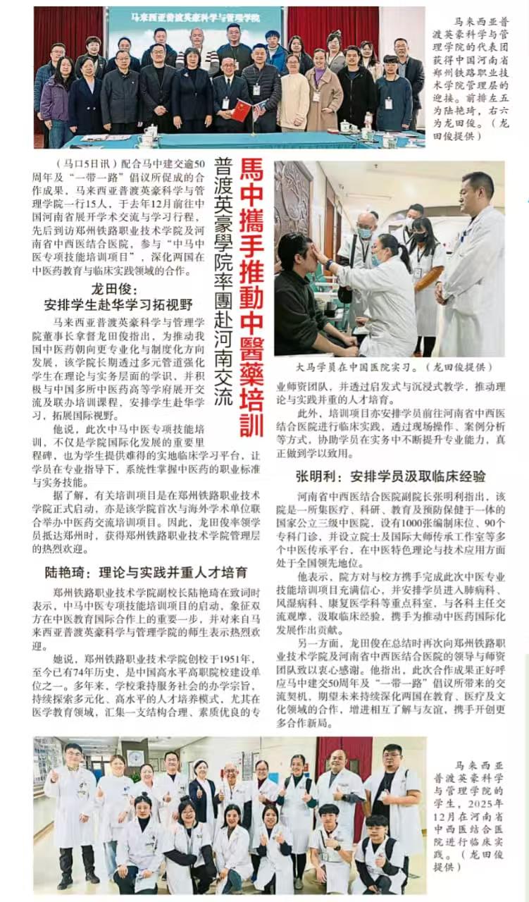 1月5日,马来西亚最具影响力的华文媒体《星洲日报》刊发题为《马中携手推动中医药培训》的专题报道,详细介绍了我校与马来西亚普渡英豪科学与管理学院、河南省中西医结合医院联合开展的“中马中医专项技能培训项目”,充分肯定了我校在推动中医药国际教育合作方面取得的积极成果与广泛影响。