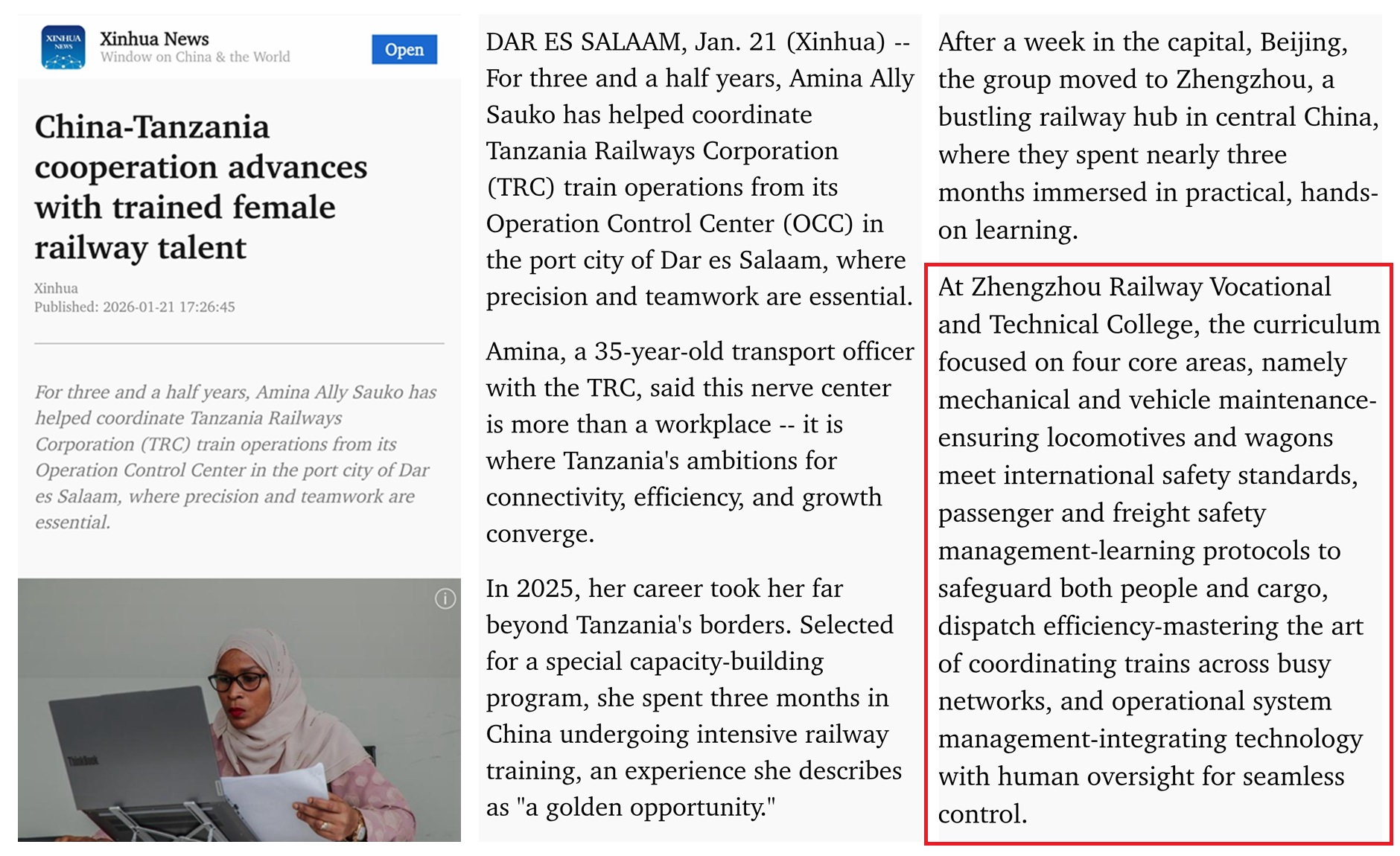 采访中,Amina回顾了为期三个月的系统化培训历程。“在郑州铁路职业技术学院,我们的课程聚焦于四个核心领域:一是铁道车辆维护,确保机车车辆符合国际安全标准;二是客货运安全管理,学习保障人员与货物安全的作业规程;三是调度指挥,掌握在复杂铁路网络中高效协调列车运行的技能;四是运营系统管理,实现技术应用与人工监管的融合,保障运输控制无缝衔接。”她特别提到中国铁路系统的高度自动化与精密调度,认为这些经验对坦桑尼亚铁路发展具有重要借鉴意义。