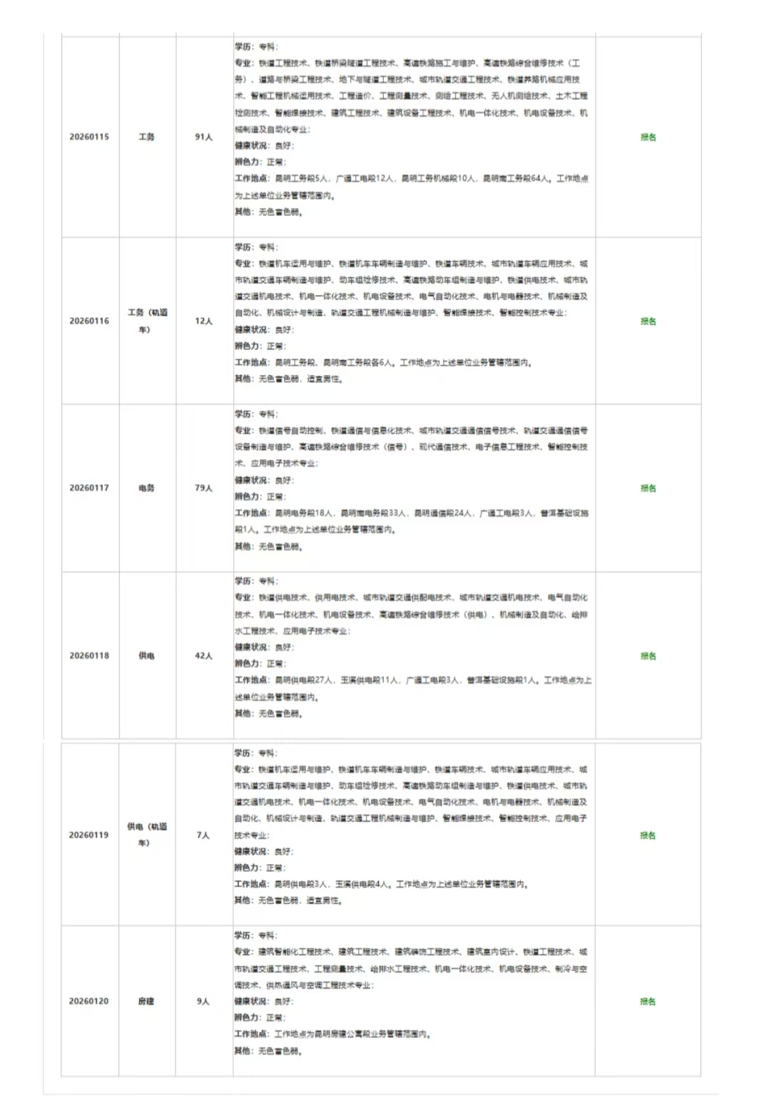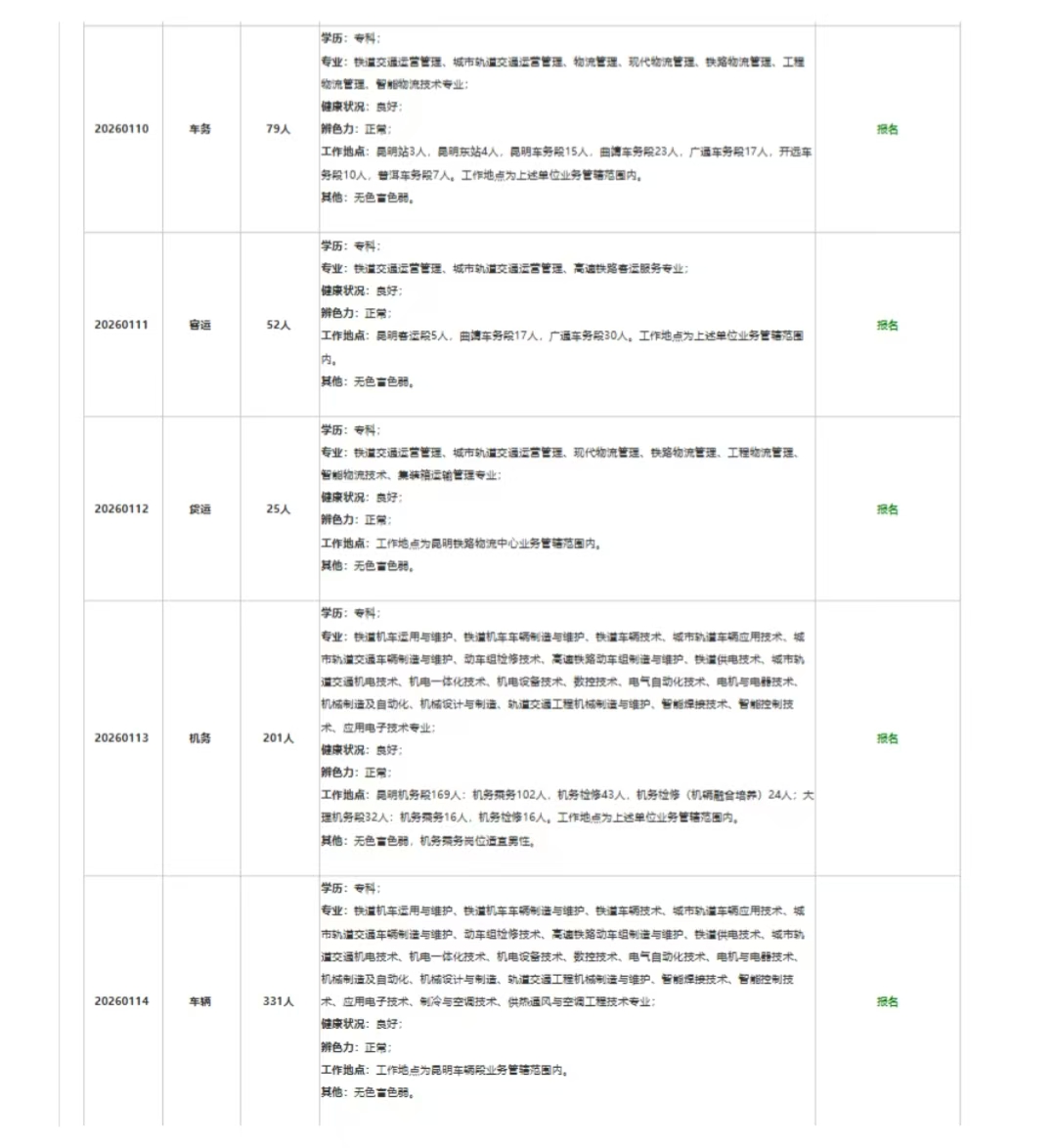 中国铁路昆明局集团有限公司根据企业发展需要,拟招聘主专业及相近专业本科及以上毕业生和主专业高职大专生,现将有关事项公告如下: 一、招聘计划 本次计划招聘1321人,招聘专业、岗位、人数和工作地点等内容详见附件。 二、应聘条件 1.2026年毕业,列入国家招生计划的普通高等院校研究生、全日制本科学历毕业生、全日制高职大专学历毕业生,或2026年1月1日至12月31日期间经国家教育部留学服务中心学历学位认证的本科及以上学历的归国留学生。2025届已毕业离校未就业毕业生以应届毕业生身份参加应聘。 2.遵纪守法,品行端正,热爱铁路事业。 3.学习成绩优良,专业、学历等符合招聘岗位要求。所学专业为铁路专业方向、所学课程包含铁路专业课程的毕业生优先。 4.身心健康,身体条件符合招聘岗位要求,无色盲色弱。 5.素质能力适应招聘岗位工作要求,服从企业对岗位、工作地点的安排和调整,新录用毕业生全部安排在中国铁路昆明局集团有限公司所属单位操作技能岗位。 6.中国铁路昆明局集团有限公司所辖范围内生源优先。 三、招聘流程 招聘流程按网上报名、资格审查、面试考核、公示录用等环节进行,具体如下: 1.网上报名。报名采取网上报名方式,报名时间为2025年10月31日至2025年11月14日。有意应聘的毕业生在规定时间内登录中国铁路昆明局集团有限公司人才招聘平台(https://rczp.kunming-railway.cn)进行注册和网上报名,按照专业与岗位匹配的原则,每人限报1个岗位。毕业生本人如实填写所有报名信息,生成打印《毕业生应聘登记表》。 2.资格审查。根据岗位需求、专业、学校办学质量及报名资料信息进行资格审核,择优筛选后分批通知符合岗位要求的毕业生参加后续面试考核。未进入下一环节的毕业生不再另行通知。 3.面试考核。面试考核时同步进行现场资格审核,分期分批组织应聘学生进行面试(同时进行个人网络测评),具体面试安排及结果由相关院校或通过中国铁路昆明局集团有限公司人才招聘平台推送消息通知应聘学生,请报名应聘学生适时关注并按通知要求参加面试考核。面试结束后,按招聘岗位人数择优确定并通知拟签约录用人选,出现空缺时在符合同岗位要求应聘人员中递补。 4.公示录用。拟录用人选通过中国铁路人才招聘网进行不少于7天的公示。公示期满无异议的,办理录用手续。 四、其他事项 1.本次招聘仅接受应聘人员本人在报名期间通过中国铁路昆明局集团有限公司人才招聘平台进行报名,无其他报名方式,不接受邮寄、他人代交简历或电子邮箱发送简历。 2.应聘毕业生在招聘期间请保持通信畅通,若未在规定时间内回复我公司通知或未按规定时间、地点和要求参加各招聘环节的,将视为本人自动放弃。 3.资格审查贯穿招聘工作全过程。应聘毕业生对本人填报信息、提供资料的真实性、准确性、完整性负责,如发现网上填报及上传信息与实际信息不一致或弄虚作假的,取消应聘资格。 4.中国铁路昆明局集团有限公司不向应聘者收取任何费用,不指定辅导用书,不举办也不委托任何机构举办任何形式的辅导培训班,请提高警惕,谨防受骗。 5.参加现场资格审核、面试考核时应聘人员应携带以下材料原件及复印件,复印件按下列顺序装订成册,收取后不予退回。 (1)本人签字确认的《毕业生应聘登记表》(报名网站下载打印); (2)教育部学籍在线验证报告; (3)全国普通高等学校毕业生就业协议书; (4)毕业生就业推荐表(加盖学校就业部门公章)、成绩单(加盖学校教务部门公章); (5)身份证及其他能够证明本人资历或能力的证书材料等; (6)体检报告。六个月内二级甲等及以上医院常规项目体检表,身高、体重、血压、辨色力、裸眼视力、听力、心电图、外科、胸片、血常规、尿常规、肝功能、肾功能(含尿酸)为必检项目,并有体检结论。 6.中国铁路昆明局集团有限公司人事部保留对本招聘公告的最终解释权。 7.咨询电话:0871-66122731;咨询时间:工作日上午8:30-11:30、下午14:30-17:00。 附件: 2.中国铁路昆明局集团有限公司2026年度招聘主专业普通高校高职大专学历毕业生计划表