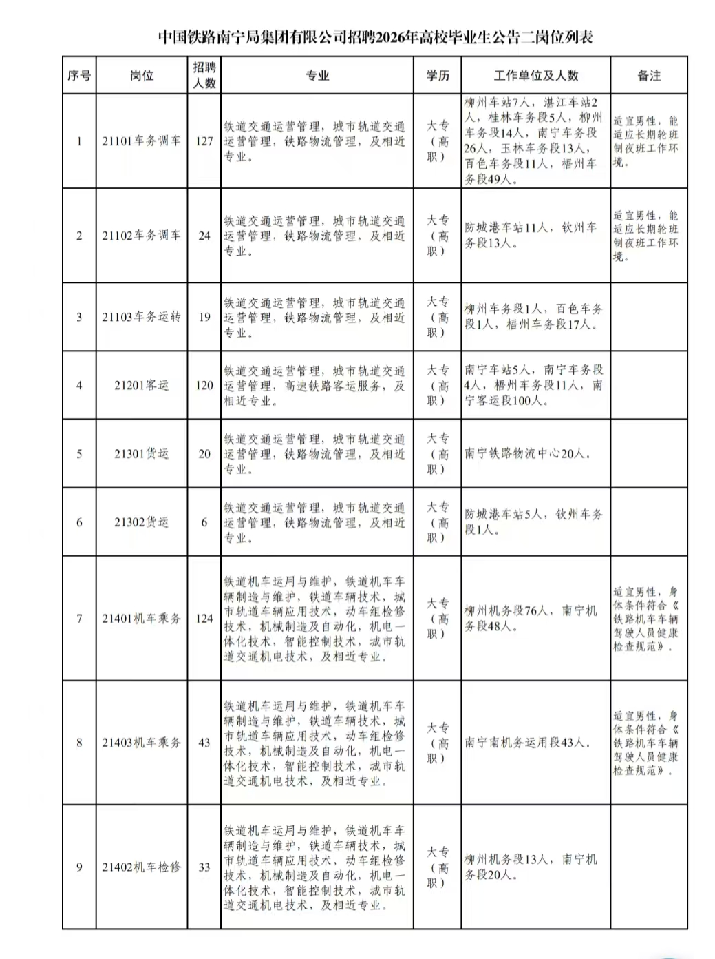 中国铁路南宁局集团有限公司根据企业经营发展需要,现公开招聘全日制应届普通高等院校大专(高职)毕业生,有关事项公告如下: 一、招聘岗位 本次计划招聘1191人,具体招聘岗位、专业、人数详见附件《中国铁路南宁局集团有限公司招聘2026年高校毕业生公告二岗位列表》。 二、报名条件 应聘毕业生应同时满足以下条件: 1.符合招聘岗位要求的专业条件,列入国家招生计划的全日制应届普通高等院校大专(高职)毕业生。在校期间所学专业方向为铁路专业方向或所学主要课程包含铁路专业课程。 2.遵纪守法,品行端正;热爱铁路事业,服从工作安排;能够适应偏远地区工作及夜班作业环境。 3.身心健康,无色盲色弱,具备正常履行岗位职责的身体条件,符合对应岗位要求和铁路行业职业健康检查规定,并以入职前单位组织的体检结果为准。 4.工作单位所在地生源优先。 三、招聘流程 1.网络报名。报名时间:2025年11月1日至2025年11月10日。应聘毕业生在规定时间内登录中国铁路人才招聘网进行网络报名,每人限报一个岗位。报名前准备好下列应聘材料: (1)学信网学籍在线验证报告、毕业生就业推荐表和成绩单(盖章原件)、本人居民身份证,以及其他能够证明本人资历、能力的材料; (2)体检报告。六个月内的二级甲等及以上医院常规项目体检表,其中血压、辨色力、视力、听力(纯音听阈测试)、心电图、胸片、血常规、尿常规、肝功能、肾功能、空腹血糖为必检项目。 应聘毕业生在报名时须上传学信网学籍在线验证报告、毕业生就业推荐表和成绩单(盖章原件)、本人居民身份证。上传材料须保证图像清晰可辨,同一材料涉及多页须合并为1张图片上传。体检报告和其他未列明的材料不必上传。 2.资格审核。根据应聘毕业生专业、岗位适配度等要素,开展网络筛选和现场审核,择优确定考试考核入围人选,应聘材料不全者审核不予通过。具体时间、地点另行通知。 3.考试考核。本次招聘采取先笔试后面试的方式分期分批组织。笔试主要考核行政职业能力,根据笔试成绩排名,按岗位招聘人数的3倍比例确定面试人选,如参加笔试人数达不到岗位招聘人数3倍比例的,则该岗位全员进入面试。考试考核具体时间、地点另行通知,未按时参加笔试或面试者视为放弃。 4.公示签约。根据各岗位面试成绩排名确定拟录用人员,通过中国铁路人才招聘网公示。其中,录用到广西沿海铁路股份有限公司下属的防城港车站、钦州车务段、南宁南机务运用段、钦州工务段、钦州电务段、钦州供电段、钦州房产生活段招聘岗位的毕业生,入职时与广西沿海铁路股份有限公司签订劳动合同。 四、注意事项 1.本次招聘通过网络报名的方式进行,不接受现场、上门、电话、传真、邮件等其他方式报名。应聘毕业生投递简历前请仔细检查核对,简历一经投递不能撤回和更换。 2.应聘毕业生须对填写的报名信息和提供材料的真实性、准确性、完整性负责,资格审查贯穿招聘全过程,如有资料不实,一经查实立即取消应聘及录用资格。 3.应聘毕业生要密切关注中国铁路人才招聘网站内消息和手机短信,错过任一招聘环节的,视为放弃应聘。招聘过程中,凡未进入下一环节者,不再单独通知,敬请谅解。 4.本次招聘不授权、不委托第三方组织招聘,不向应聘毕业生收取任何费用,不指定辅导用书,不举办也不委托任何机构或个人举办任何形式的辅导培训班,请应聘毕业生提高警惕,谨防受骗。 5.中国铁路南宁局集团有限公司人事部保留对本招聘公告的最终解释权。咨询电话:0771-2722731,咨询时间:9:00-12:00、15:00-18:00(工作日)。