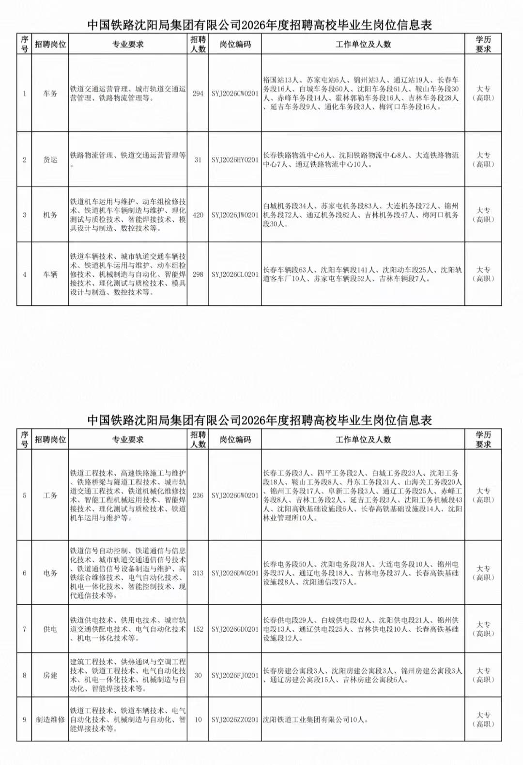 中国铁路沈阳局集团有限公司根据企业发展需要,拟招聘全日制普通高等院校大专(高职)学历毕业生,现将有关事项公告如下: 一、招聘计划 本次计划招聘1784人,招聘专业、岗位、人数和工作单位等内容详见附件。 二、应聘条件 1.列入国家招生计划,全日制普通高等院校大专(高职)学历应届毕业生; 2.遵纪守法,品行端正,热爱铁路事业,认同企业文化; 3.在校所学专业为铁路专业方向,所学课程包含铁路专业课程,专业、学历等符合招聘岗位要求; 4.身心健康,无色盲色弱,身体条件符合招聘岗位要求; 5.服从企业对岗位的安排和调整,能够适应偏远地区、长期夜班、轮班制等工作环境; 6.工作所在地生源优先。 三、招聘流程 招聘流程按网上报名、资格审查、面试考核、公示录用等环节进行,具体如下: 1.网上报名。报名采取网上报名方式,报名时间2025年11月3日至2025年12月20日。有意应聘毕业生在规定时间内登录中国铁路人才招聘网(http://rczp.china-railway.com.cn)进行网上报名。申请岗位时选择“中国铁路沈阳局集团有限公司2026年度招聘高校毕业生公告(二)”所对应岗位,每人限报1个岗位。毕业生本人应认真如实填写报名信息,并上传个人照片、就业推荐表、成绩单、教育部学籍在线验证报告等相关材料。提交前请仔细核对,图像应清晰可辨认,信息要完整准确,报名成功后不予退回更改。 2.资格审查。根据招聘岗位要求,对应聘人员报名信息进行审核,择优筛选符合岗位要求的毕业生参加后续考核。未进入考核环节的应聘毕业生恕不另行通知。 3.面试考核。采取面试考核方式进行考核,根据考核成绩择优确定拟录用人选。 4.公示录用。拟录用人选通过中国铁路人才招聘网公示。公示期满无异议的,办理录用手续。 四、其他事项 1.本次招聘仅接受毕业生本人在报名期间通过中国铁路人才招聘网报名,无其他报名方式,不接受上门、邮寄、他人代交简历或电子邮箱发送简历。 2.应聘毕业生在招聘期间须保持联系方式畅通,关注报名网站的站内信,凡未按规定时间、地点和要求参加各招聘环节的,视为本人自动放弃。招聘过程中,凡未进入下一环节者,不再单独通知。 3.所有信息须由应聘毕业生本人如实填报,如发现信息不实或弄虚作假的,取消应聘资格或录用资格。 4.中国铁路沈阳局集团有限公司不向应聘者收取任何费用,不指定辅导用书,不举办也不委托任何机构举办任何形式辅导培训班,请提高警惕,谨防受骗。 5.参加面试考核时应聘毕业生须携带以下材料原件及复印件,复印件不予退回。 ⑴经本人签字确认的“毕业生应聘登记表”(在中国铁路人才招聘网“个人中心-我的信息-我的工作申请-简历下载”中生成打印); ⑵身份证,各种能够证明本人资历或能力的证书材料等; ⑶毕业生就业推荐表(加盖学校就业部门公章),成绩单(加盖学校教务部门公章),教育部学籍在线验证报告(教育部学信网下载打印); ⑷全国普通高等学校毕业生就业协议书; ⑸体检报告。六个月内二级甲等及以上医院常规项目体检报告,血压、辨色力、视力、听力、心电图、胸片、血常规、尿常规、肝功能、肾功能为必检项目,须有体检结论。 6.中国铁路沈阳局集团有限公司招聘毕业生的官方网站为中国铁路人才招聘网。 7.中国铁路沈阳局集团有限公司保留对本招聘公告的最终解释权。 8.咨询电话:024-62024851; 咨询时间:报名期间工作日上午:9:00-11:00;下午:15:00-17:00。