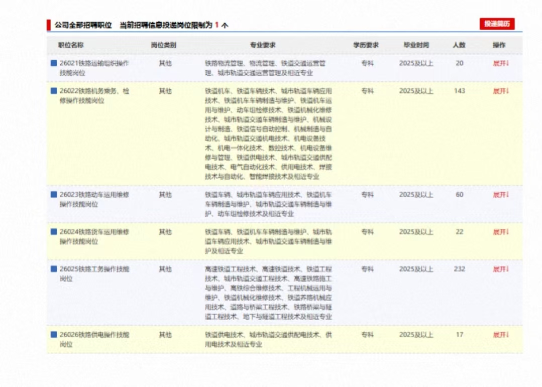 根据运输生产工作需求,中国铁路青藏集团有限公司拟招聘2026年全日制普通高校大专(高职)毕业生,现将具体事宜公告如下: 一、招聘计划 招聘岗位信息详见岗位信息表。 二、招聘条件及要求 (一)遵纪守法,品行端正,热爱铁路事业。 (二)符合招聘岗位要求的专业条件,列入国家招生计划,2026年、2025年毕业的未与其他任何单位签订就业协议或劳动合同的全日制普通高校大专(高职)毕业生。在校期间所学专业为铁路方向或所学主要课程中包含铁路专业课程。 (三)具备正常履行岗位职责的身体条件和心理素质。 (四)服从集团公司对岗位的安排和调整,能够适应集团公司管内高原气候和沿线艰苦地区工作环境及夜班作业,工作单位所在地生源优先。 三、招聘流程 (一)网络报名。本次招聘只接受网上报名,应聘毕业生通过“中国铁路人才招聘网”实名注册进行报名,完整填写本人基本信息,并上传教育部学籍在线验证报告(登陆中国学信网www.chsi.com.cn,按提示生成)。按照岗位要求与专业要求相一致的原则选择岗位进行网上报名,每人只能投递一次简历且限报1个岗位,简历一经投递不允许撤回和更换,投递前请仔细核对检查。 报名时间:2025年11月5日至2025年12月31日。 (二)资格审查。对应聘毕业生提交的材料进行审核,根据招聘岗位报名条件、学历、专业要求等择优筛选应聘毕业生进入考核环节。 (三)考试考核。已面试考核为主,根据筛选结果分期分批组织进行,接到通知的毕业生按指定时间、地点参加,否则视为放弃应聘。 毕业生在面试环节应携带以下资料: 1.中国铁路人才招聘下载打印的《毕业生应聘登记表》(需本人签名); 2.《教育部学籍在线验证报告》,2025年毕业的毕业生还需提供毕业证复印件; 3.身份证原件及复印件; 4.毕业生就业推荐表、就业协议书原件、在校所学全部学科的成绩单原件并加盖公章; 5.二级甲等及以上医院,近六个月的体检报告(要求有检查结论),必检项目为血压、辨色力、视力、听力、心电图、胸片、腹部B超、血常规、尿常规、肝功能、肾功能; 6.各类获奖证书及其他能够证明本人资历或能力材料的原件及复印件。 (四)录用公示。根据考试考核情况择优确定拟录用人员,通过中国铁路人才招聘网进行公示。 在各招聘环节中,对未能进入下一环节的应聘毕业生不再另行通知,敬请谅解。 四、其他事项 (一)本次招聘仅接受应聘毕业生本人通过中国铁路人才招聘网报名,不接受上门、电话、传真、邮件等其他方式报名。 (二)应聘人员应确保注册使用的邮箱及联系电话正常使用,因通信不畅等原因导致未按要求参加应聘的,视为个人自动放弃。 (三)应聘人员应保证有关报名信息和所提交应聘材料的真实性,一经发现弄虚作假,立即取消应聘资格。 (四)中国铁路青藏集团有限公司不收取应聘毕业生任何费用,不指定辅导用书,不举办也不委托任何机构举办任何形式的辅导培训班,请提高警惕,谨防社会机构或个人冒名诈骗。 (五)中国铁路青藏集团有限公司保留对招聘公告及相关规定的最终解释权。 (六)报名咨询电话:0971-7193361 咨询时间:工作日上午09:00-11:30 下午14:00-17:00