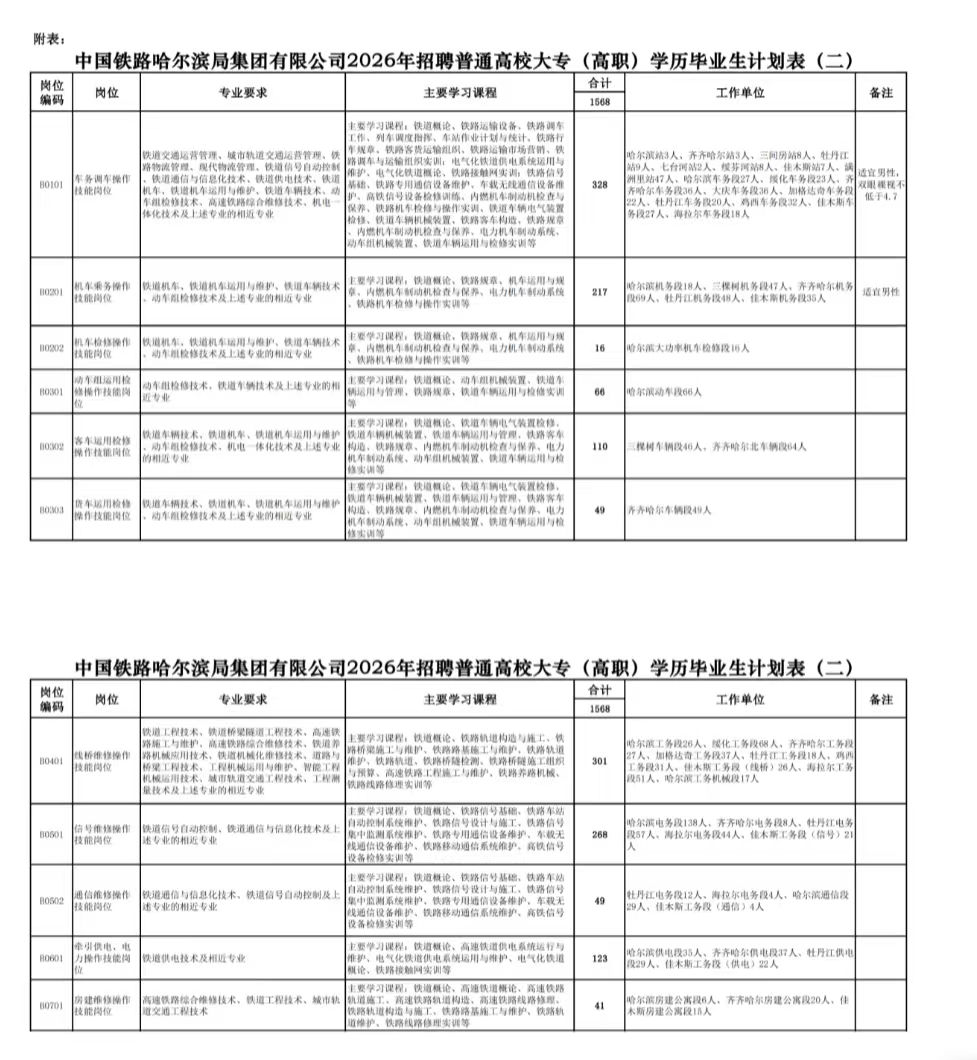中国铁路哈尔滨局集团有限公司根据企业发展需要,拟招聘普通高校大专(高职)学历毕业生,现将有关事项公告如下: 一、招聘计划 本次计划招聘1568人,招聘岗位、专业、人数和工作地点等详见附表。 二、应聘条件及须知 1.列入国家统一招生计划,2025年、2026年毕业的普通高校大专(高职)学历毕业生。 2.遵纪守法,品行端正,思想政治素质良好。 3.应聘专业以主修专业为准,与招聘岗位需求一致,所学专业为铁路方向,主要课程为铁路专业课程和铁路实训课程。 4.身体健康,辨色力正常,无色盲色弱,听力、视力良好。其中B0101车务调车岗位双眼裸视不低于4.7,其他岗位双眼矫正视力不低于5.0。 5.热爱铁路事业,同意中国铁路哈尔滨局集团有限公司及所属用人单位对工作岗位和工作地点的安排和调整。能够适应边远地区、铁路沿线工作及户外、野外、夜间、高空和轮班制工作环境。身体条件、素质能力适应招聘岗位工作要求。 三、报名方法 应聘毕业生在“中国铁路人才招聘网”(http://rczp.china-railway.com.cn)注册报名,对照招聘岗位要求进行申报(每名应聘毕业生限报1个岗位),并下载打印《毕业生应聘登记表》。报名时间:2025年11月24日至2025年12月3日。 四、招聘流程 采取网上报名、资格遴选、面试考核、公示招聘结果、办理录用手续等程序进行招聘。中国铁路哈尔滨局集团有限公司将根据招聘岗位需求分期分批审核遴选应聘毕业生进行面试考核,具体事宜通过“中国铁路人才招聘网”向个人注册邮箱发送通知,请应聘毕业生注意关注。招聘过程中,未进入下一环节恕不另行通知。 五、其他事项 1.应聘毕业生报名前需准备好以下材料,报名时上传除《毕业生应聘登记表》以外所有材料扫描件,材料上传不齐全或无法辨认的,将会影响资格审查及后续应聘环节。参加面试时要携带以下所有材料原件及复印件: 2026年毕业生:《毕业生应聘登记表》(需本人签名),身份证,学校盖章的《就业推荐表》,时间最近的《成绩单》,《毕业生就业协议书》(学校需网络签约的不用上传),有效期内的《教育部学籍在线验证报告》,近6个月的体检报告(二级甲等及以上医院,必检项目为血压、辨色力、视力、听力、心电图、胸片、血常规、尿常规、肝功能、肾功能等),与专业学习相关的获奖荣誉证书。 2025年毕业生:《毕业生应聘登记表》(需本人签名),身份证,毕业证,《毕业生就业协议书》(学校需网络签约的不用上传),有效期内的《教育部学籍在线验证报告》,近6个月的体检报告(二级甲等及以上医院,必检项目为血压、辨色力、视力、听力、心电图、胸片、血常规、尿常规、肝功能、肾功能等),与专业学习相关的获奖荣誉证书。 2.拟录用名单在“中国铁路人才招聘网”进行公示。 3.应聘毕业生发生以下情形将取消应聘或录用资格。一是应聘信息弄虚作假者;二是与其他单位已经签订就业协议(劳动合同)未解除者,与其他单位存在劳动关系纠纷未处理完毕或留有纠纷隐患者;三是身体条件不符合申报岗位要求或入职体检不合格者;四是发生或隐瞒个人违法违纪情形者;五是集中组织入职报到时未能按期毕业或未取得毕业证者;六是未在指定期限内报到及参加入职体检者。 4.中国铁路哈尔滨局集团有限公司在招聘过程中根据实际需求分期分批发布面试通知,应聘毕业生未按指定时间地点参加,视为本人自动放弃。 5.网络报名后,应聘毕业生需保持所提供的联系方式有效、畅通,因通信不畅造成的后果,中国铁路哈尔滨局集团有限公司不承担责任。 6.本次招聘不接受上门、邮寄或他人代交简历。 7.本次招聘中国铁路哈尔滨局集团有限公司不授权、不委托第三方(含其他任何机构、个人)组织招聘,不指定复习资料,不向应聘毕业生收取任何费用,不举办任何形式的辅导培训班,请应聘毕业生提高警惕,谨防受骗。 8.中国铁路哈尔滨局集团有限公司人事部保留对招聘公告的最终解释权。 9.咨询电话:0451—86428781 咨询时间:工作日13:30—16:30