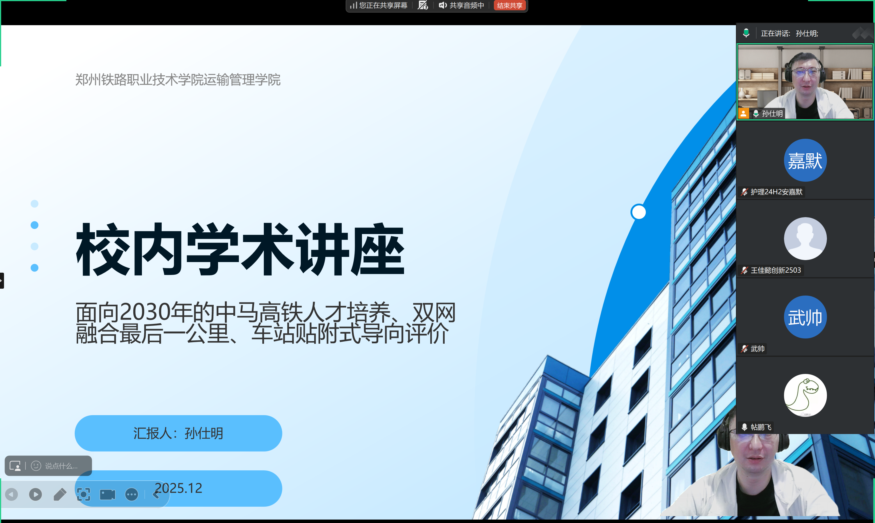 为紧跟轨道交通行业发展前沿,深化产教融合育人模式改革,提升专业建设与人才培养质量,12月5日,运输管理学院举办主题为“面向2030年的中马高铁人才培养、双网融合最后一公里、车站贴附式导向评价”的校内学术讲座。本次讲座由学院铁道交通运营管理教研室主任孙仕明主讲,学院师生代表在线聆听了讲座。