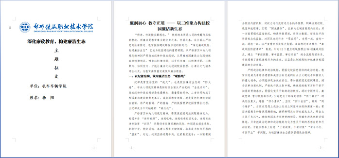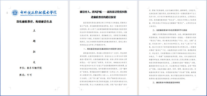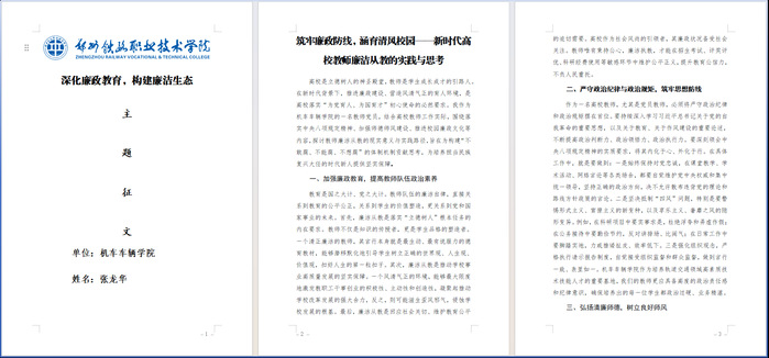 为深入贯彻落实学校党委、纪委关于2025年党风廉政建设宣传教育月活动的统一部署,根据《郑州铁路职业技术学院2025年党风廉政建设宣传教育月活动方案》的具体要求,机车车辆学院党总支高度重视,面向全体党员同志,于2025年11月20日成功举办了以弘扬廉洁文化为主题的党风廉政建设征文活动。