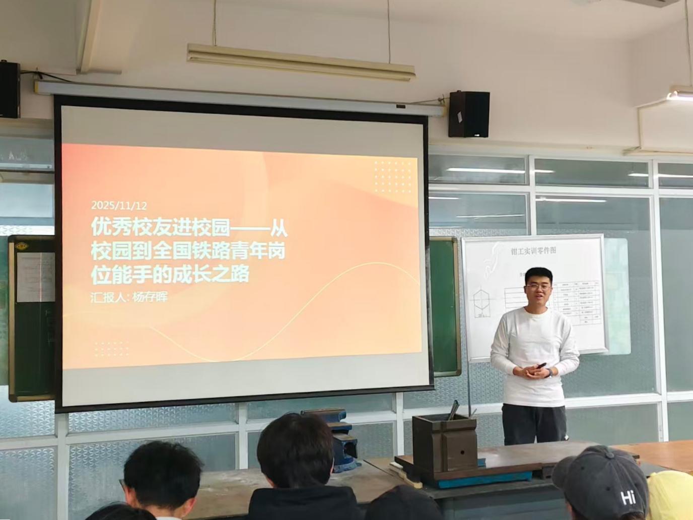2025年11月12日,机钳教研室特邀全国铁路青年岗位能手杨存晖校友重返校园,带来 “从校园到全国铁路青年岗位能手的成长之路”为主题的分享,并深入智能智造和机电新技术协会备赛现场进行技术指导。