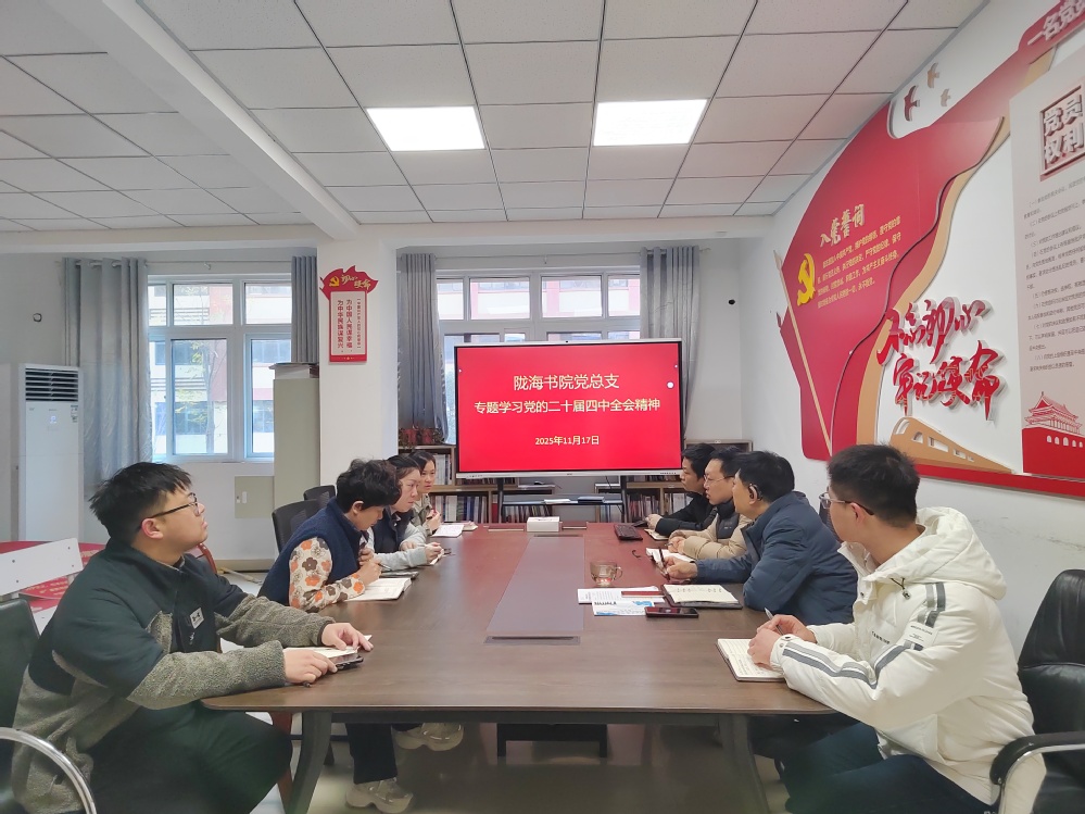 11月17日下午,陇海书院党总支在党团活动室召开专题会议,集中学习党的二十届四中全会精神,深入领会习近平总书记在全会上的重要讲话精神及《中国共产党第二十届中央委员会第四次全体会议公报》核心要义。全体党员参会,党总支书记刘斌主持会议并领学。
