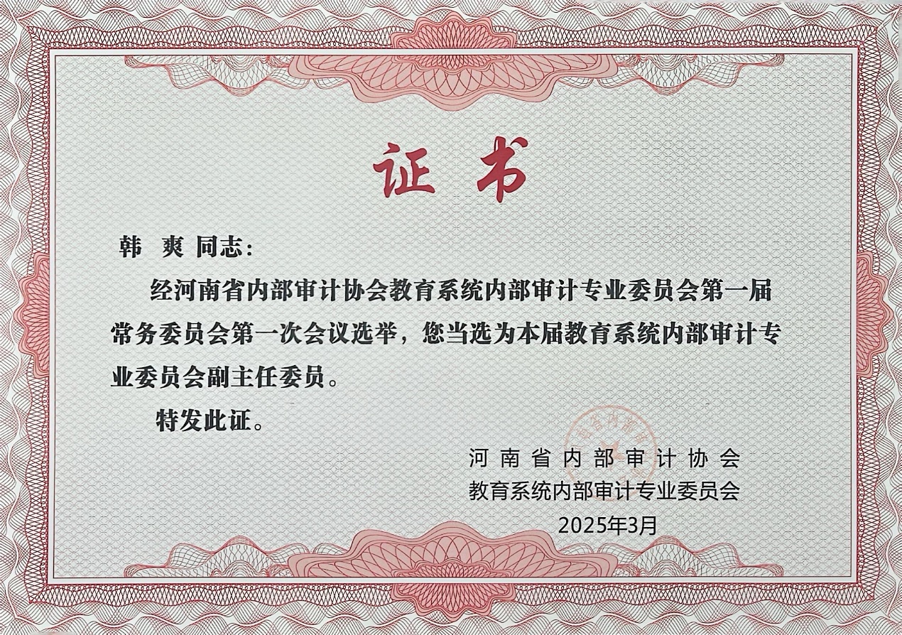 我校韩爽同志作为全省高职院校唯一当选河南省内部审计协会教育系统内部审计专业委员会副主任委员,既是对我校审计工作成效的充分肯定,也为我校深度参与省级教育系统审计资源、加强学术交流与协同创新、完善教育内部审计制度以及经验推广提供了更高平台。未来,我校将以此为契机,持续深化审计监督与服务职能,为学校高质量建设和全省教育系统健康发展贡献力量。