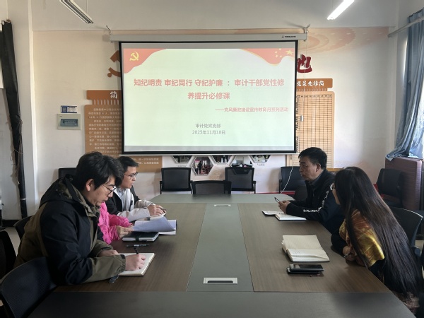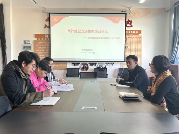 11月18日,审计处党支部围绕“深化廉政教育,构建廉洁生态”主题,举办党风廉政主题党课暨集体廉政谈话会,全体党员参加会议。
