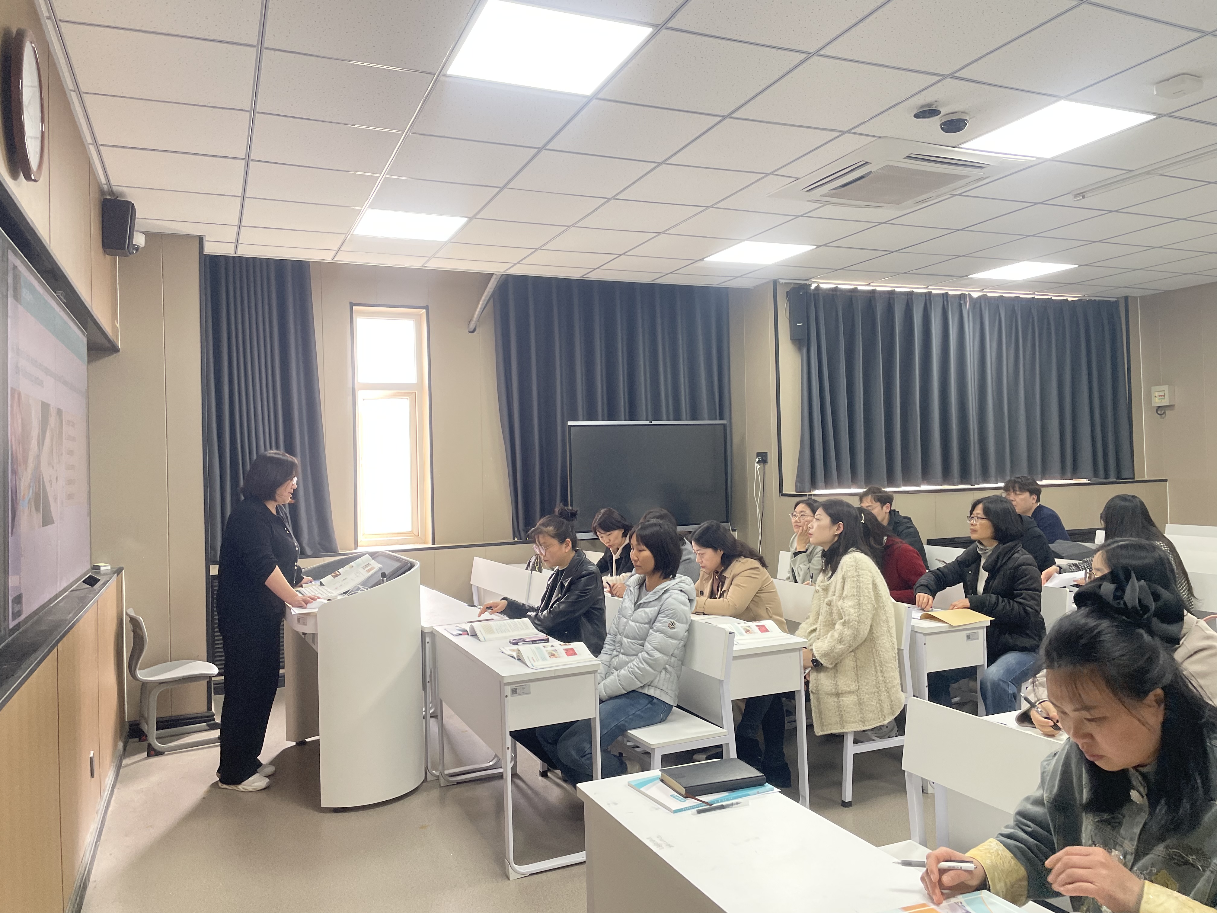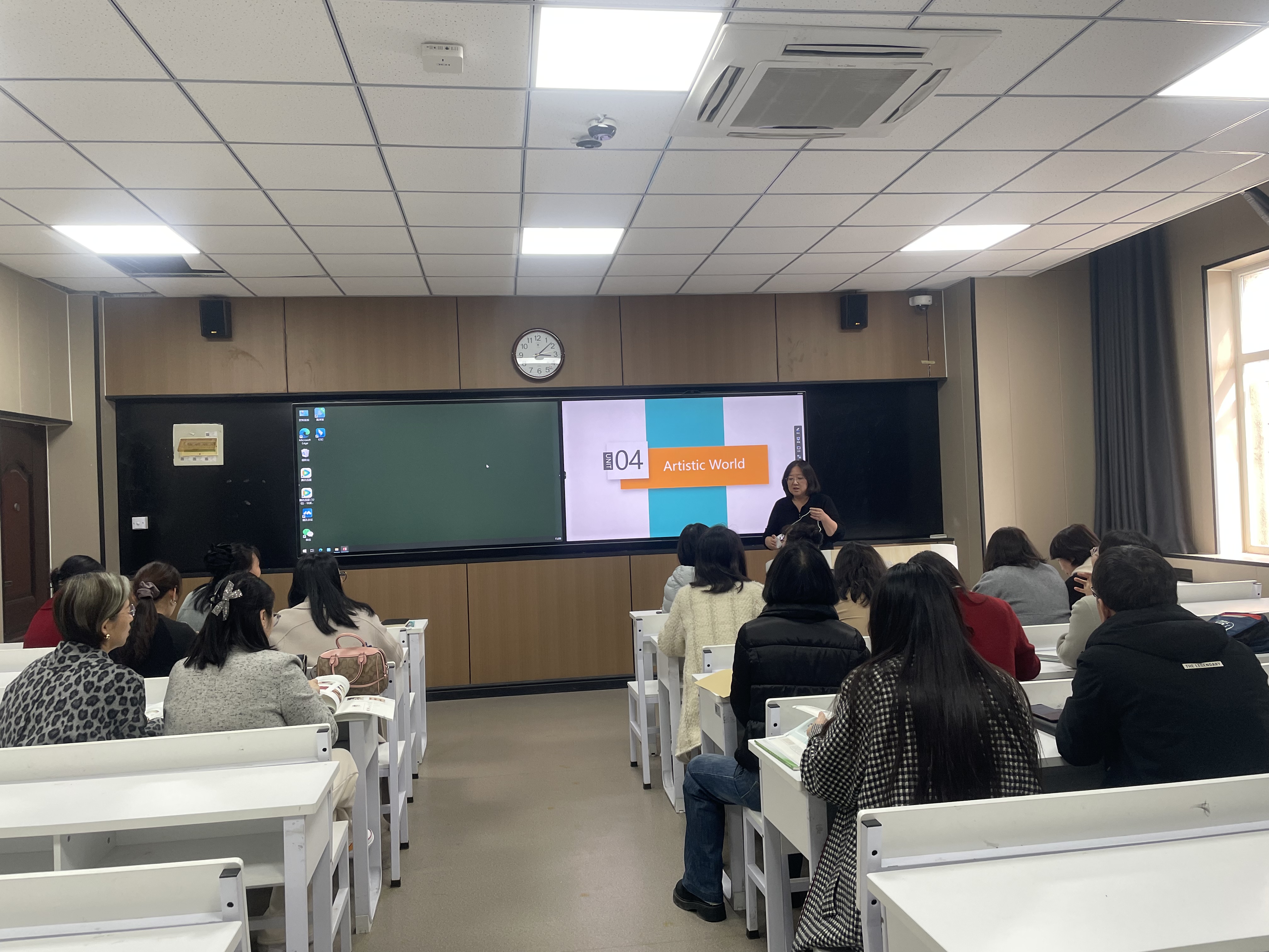 本次集体备课活动在智慧教室7433举行。全体参会教师就《大学英语》课程的教学实践、知识点讲解及跨文化教学融合等关键议题,进行了深入的交流与探讨。张晓艳老师作为主讲人,重点解读了《大学英语》第4单元“Artistic World”的教学内容。她结合单元教学要求,全面分享了本单元的教学思路和核心知识点,着重讲解了中华传统民间艺术相关的英语词汇及常用句式。张晓艳老师结合具体教学实例,演示了如何用规范、地道的英语介绍中国书法(calligraphy)、剪纸(paper cutting)和中国戏曲等传统民间艺术,帮助参会教师理清了传统文化与英语教学相结合的教学思路,为实现语言教学与文化传播的有机结合提供了有益参考。