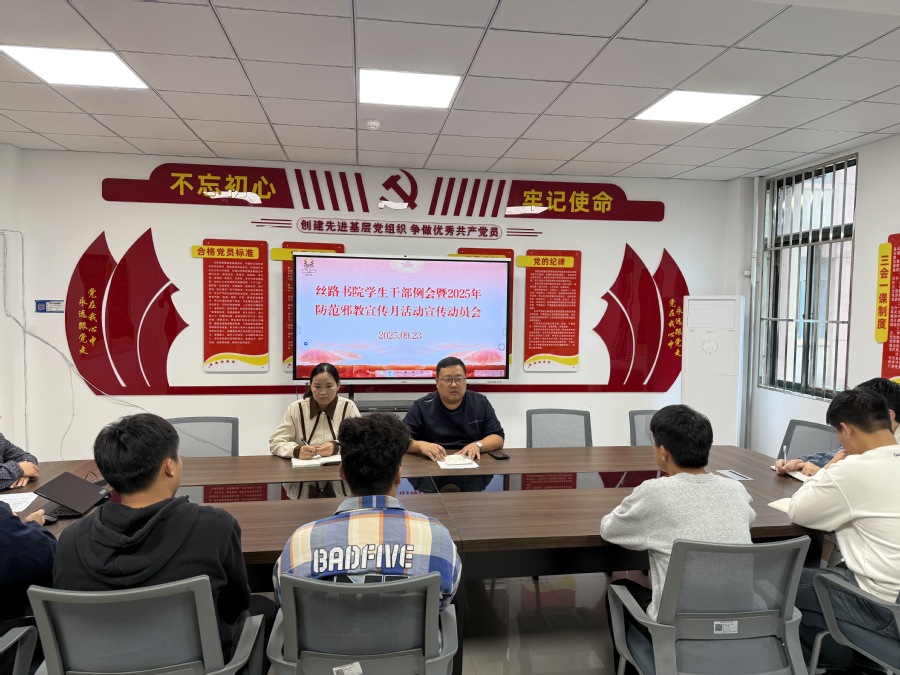 9月23日,丝路书院在书院二楼活动室召开学生干部例会暨防范邪教宣传月宣传动员会,分团委书记张晓远、副书记索利巧以及23级学生干部参加了本次会议。