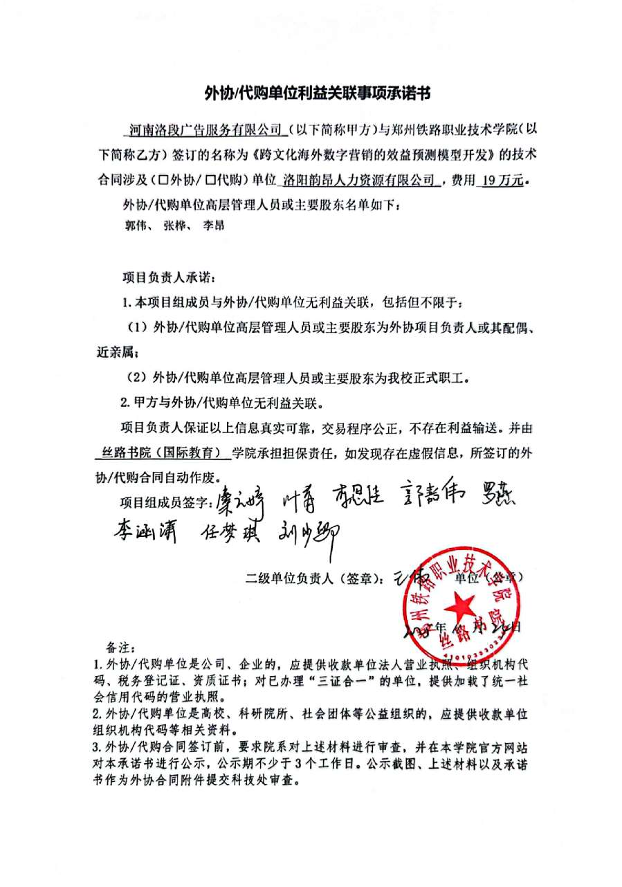 外协单位利益关联事项承诺书