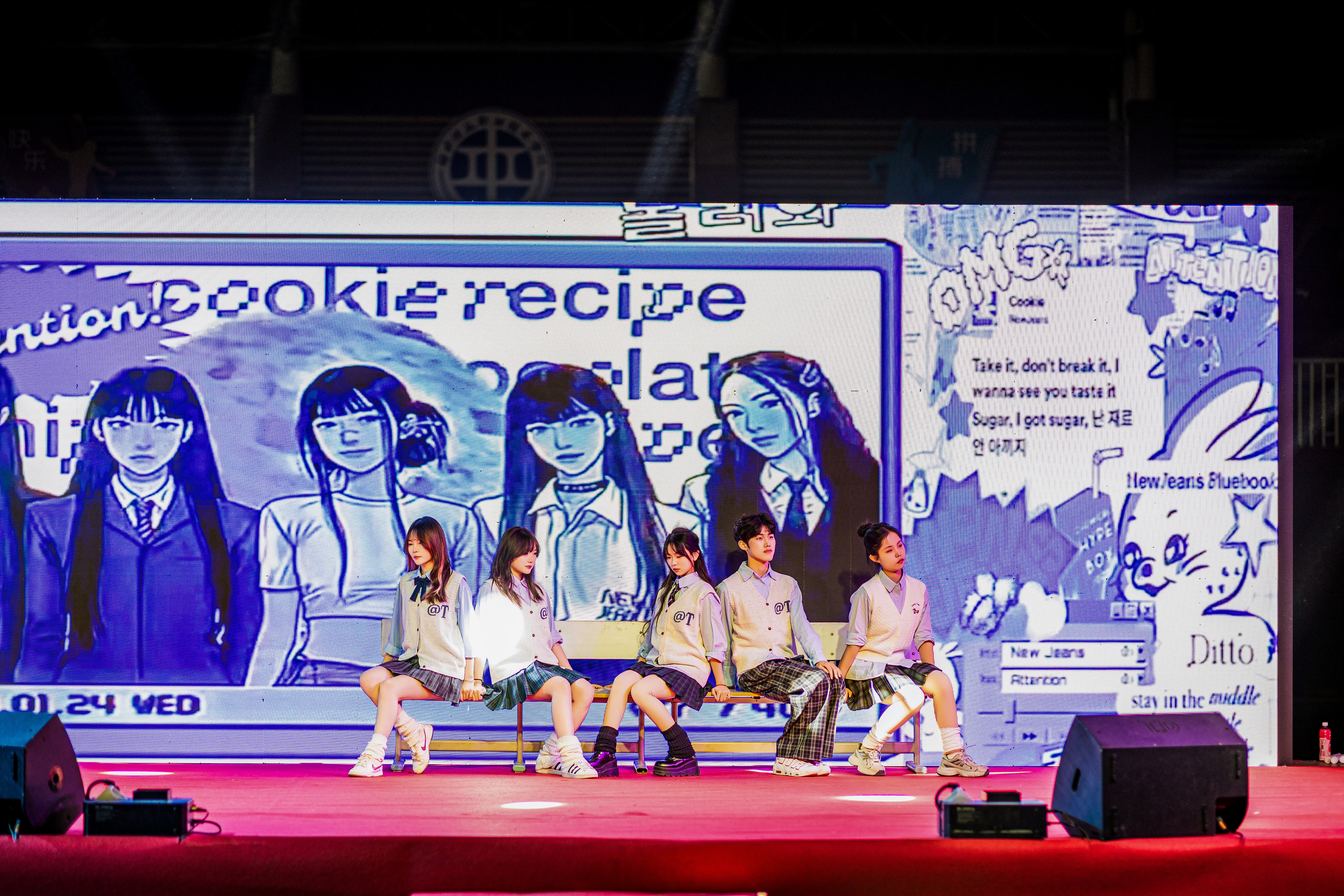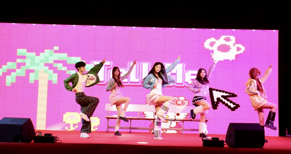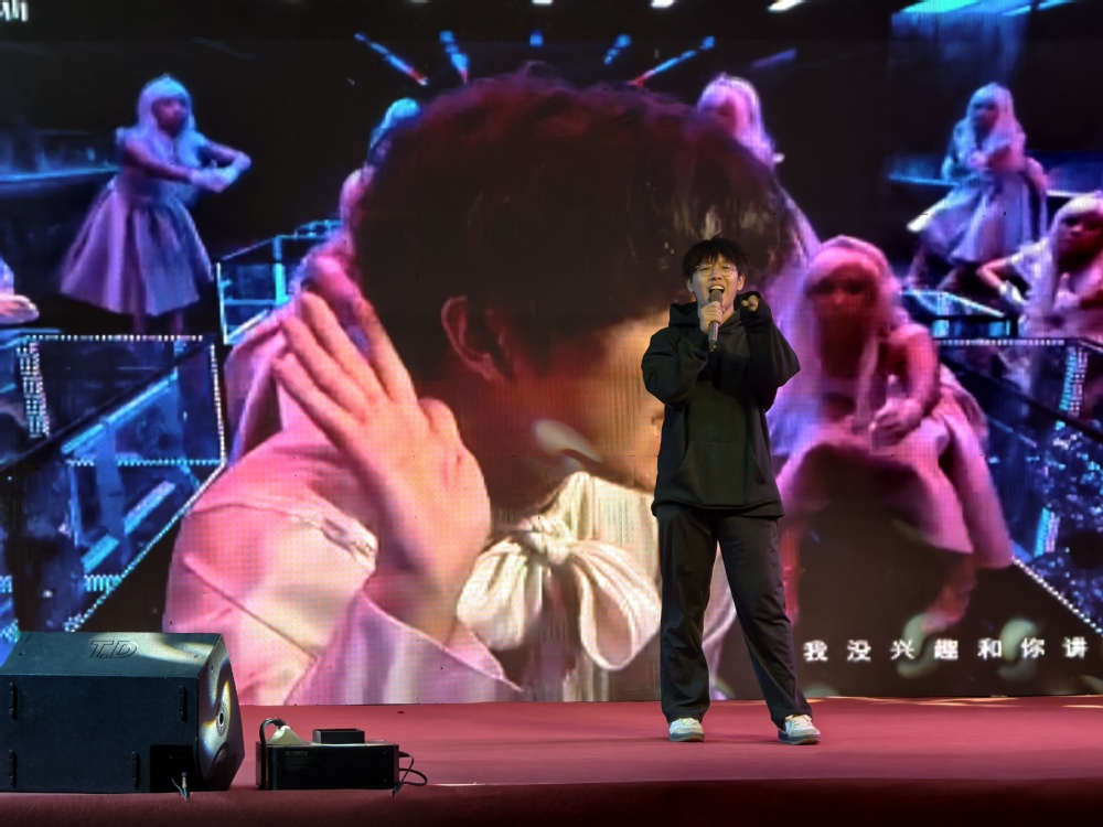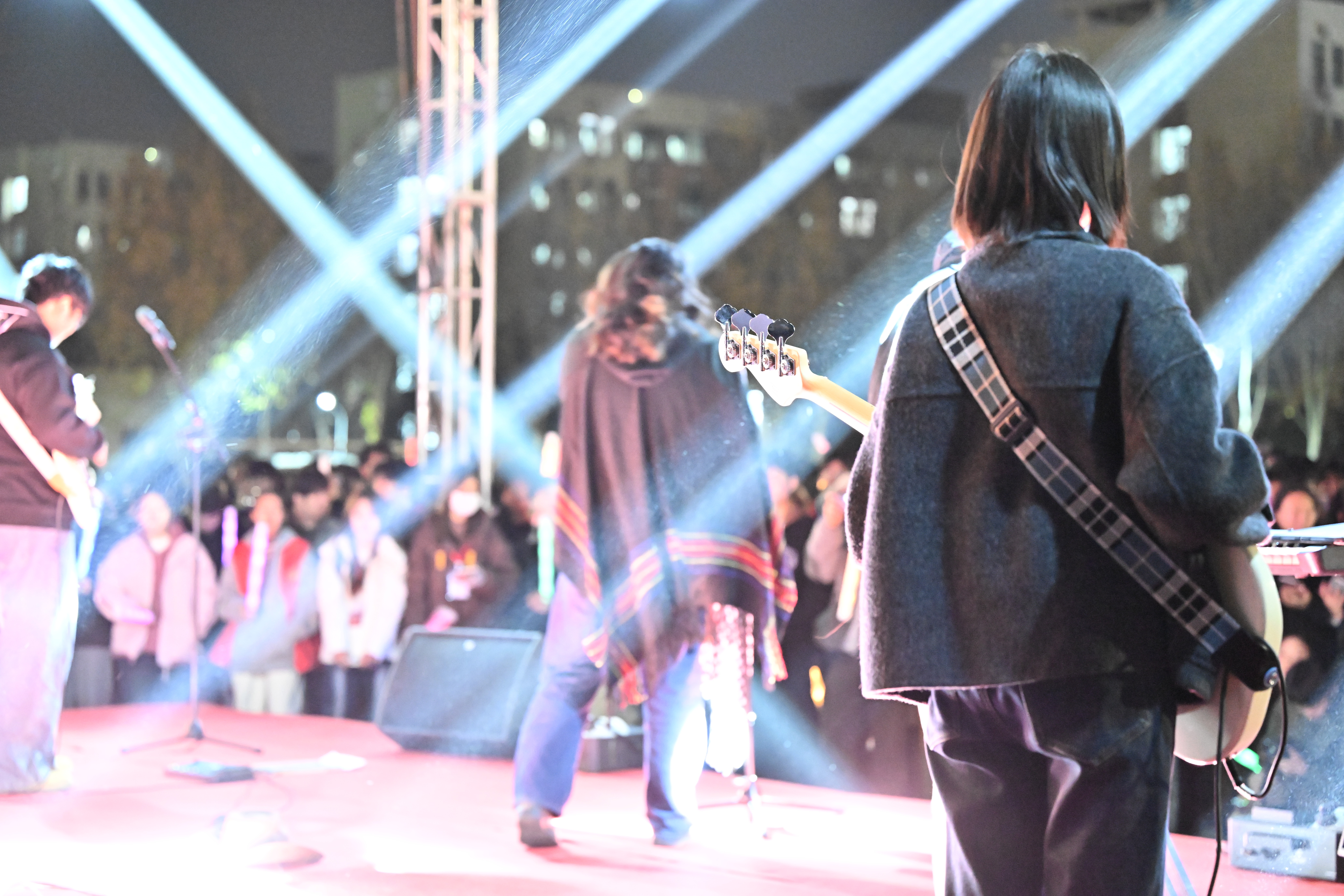 18时整,以“乐潮丝路‘音’你沸腾”为主题的电音节准时开幕。舞蹈、独唱、合唱轮番上阵,更有模特走秀、抽奖环节和主持人互动。多支乐队连续献演,他们凭借专业的混音技巧和极具感染力的舞台表现,为现场观众带来了涵盖多种风格的电子音乐作品。从舒缓的旋律到激昂的节奏,每一首曲目都引发全场共鸣,台下师生跟随着音乐节拍挥舞荧光棒,形成一片璀璨的“星光海洋”。