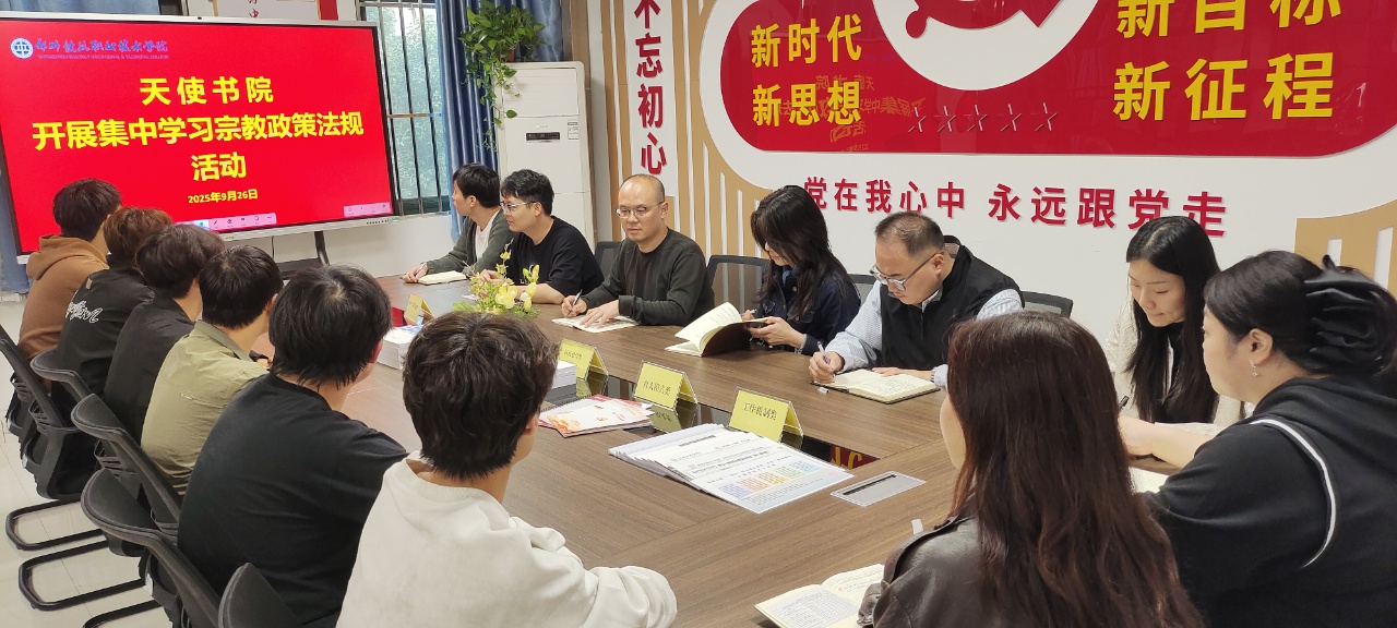 9月26日上午,天使书院在二楼会议室开展宗教政策法规集中学习活动。书院育人导师及各年级学生代表参加学习,党总支副书记魏冠义主持活动。