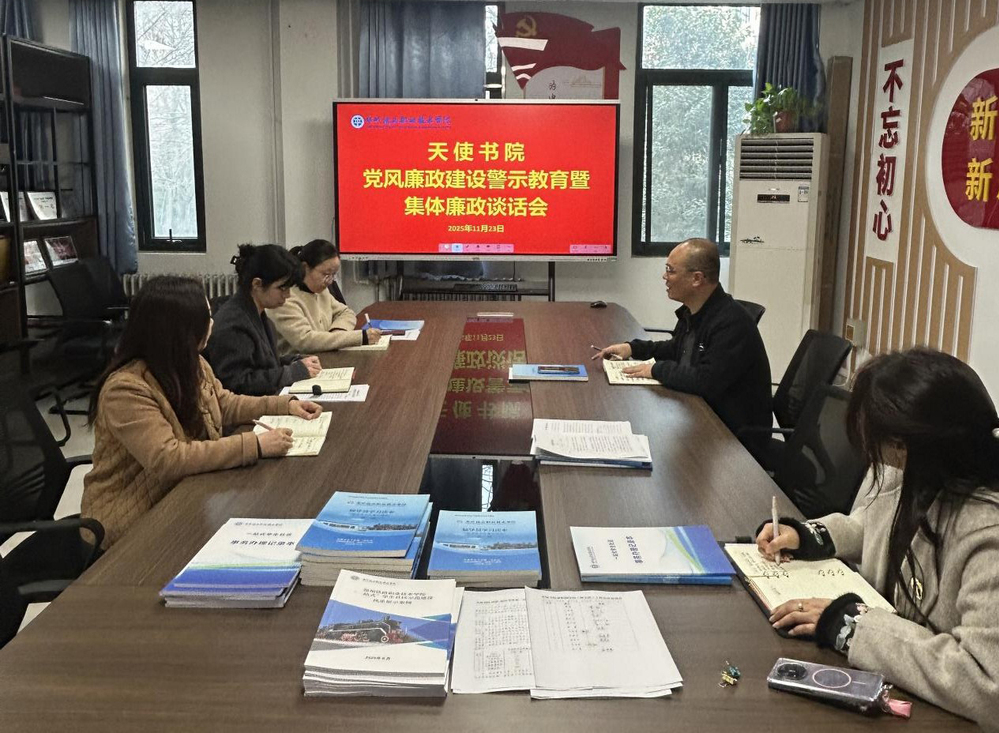 11月26日,天使书院召开党风廉政建设警示教育暨集体廉政谈话会,党总支书记魏冠义主持,班子成员、全体专职辅导员参与。