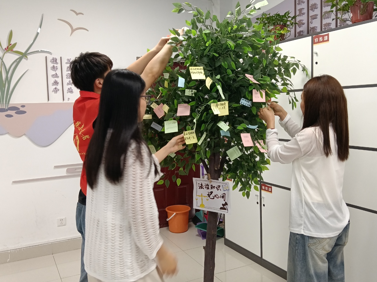 随后,师生们移步书院博雅讲堂,参与“法治知识树”与互动答题环节。翠绿的知识树上挂满印有《中华人民共和国民法典》《中华人民共和国治安管理处罚法》核心条款及反诈常识的彩色卡片,师生们可随手摘取学习;法治安全答题环节采用现场抢答形式,题目涵盖校园安全、权益保护、反诈技巧等热点内容,大家踊跃举手、积极应答,现场气氛热烈。“答题让抽象的法律知识变得鲜活,记得更牢了。” 参与活动的学生代表说道。