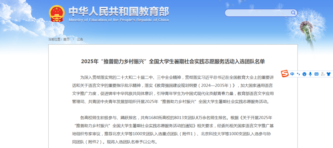 2025年7月3日,教育部语言文字应用管理司、共青团中央青年发展部公布2025年“推普助力乡村振兴”全国大学生暑期社会实践志愿服务活动团队入选名单,我校两支队伍在全国8013支团队中脱颖而出,成功入选。
