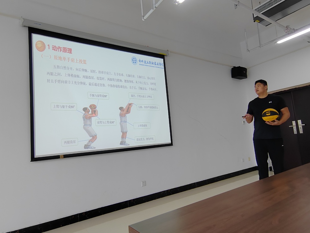 展示环节,靳乐乐老师以《原地单手肩上投篮》为教学主题,结合学生学情设计教学流程,在动作讲解、示范演示、课堂互动等环节充分展现个人教学思路,呈现了规范的技术指导,同时也暴露了“动作展示不够规范”“教学节奏把控不足”等待改进问题。
