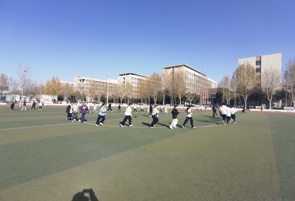 课堂伊始,“音乐+游戏”的热身环节便迅速点燃氛围。赵老师将慢跑、碎步跑、折返跑等多种跑步练习,与经典的“喊数抱团”游戏巧妙融合,随着节奏鲜明的音乐响起,学生们在跑动中反应敏捷、配合默契,不仅充分活动了关节、激活了身体机能,更在互动中收获了欢笑,彻底打破了传统热身的沉闷感。
