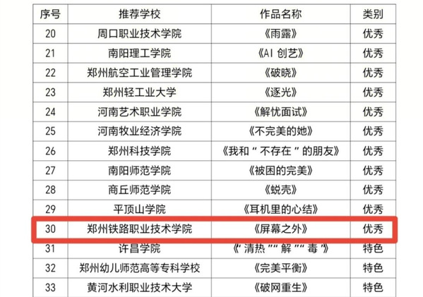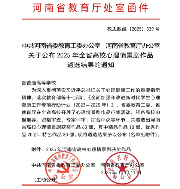 近日,中共河南省委教育工委办公室、河南省教育厅办公室发布《关于2025年全省高校心理情景剧作品遴选结果的通知》(教思政函【2025】539号),我校选报的心理情景剧《屏幕之外》从众多参赛作品中脱颖而出,获评优秀作品奖。