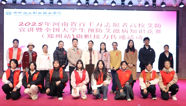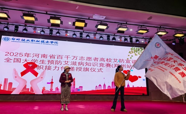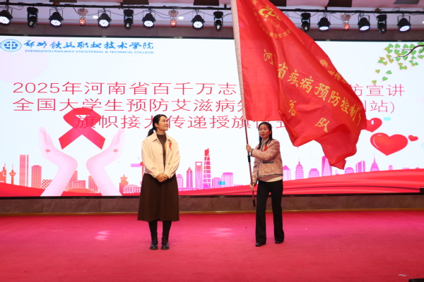 11月18日下午,河南省百千万志愿者高校艾防宣讲暨全国大学生预防艾滋病知识竞赛(郑州站)旗帜交接仪式,在郑州铁路职业技术学院新校区举行。我校是河南省省会高校防艾旗帜传递的第4站,本次活动由河南省疾病预防控制局、河南省疾病预防控制中心主办,学校联合郑州市卫生健康委员会、郑州市疾病预防控制中心承办,郑州市疾控中心和接旗单位——郑州师范学院的相关部门领导、双方师生代表,大家齐聚一堂,凝聚多方力量筑牢校园防艾屏障。