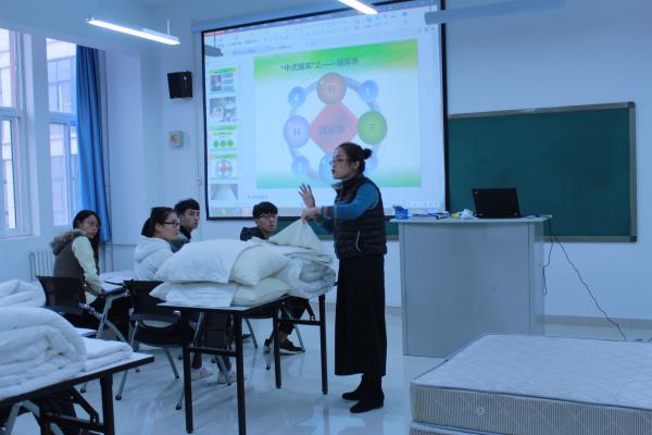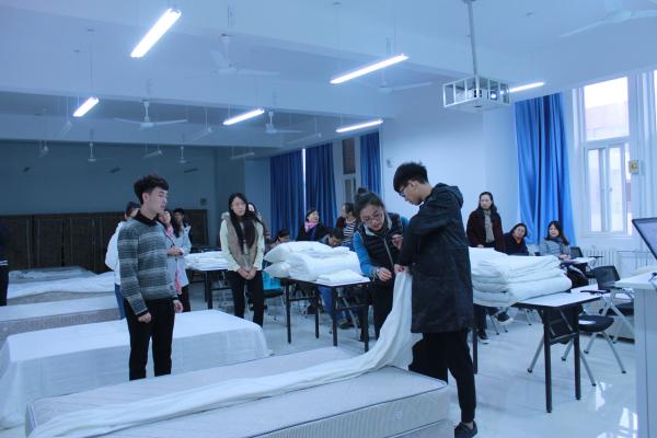 本次示范课由酒店管理教研室田露老师进行讲授和示范。授课内容为《前厅客房服务与管理》课程中的“中式铺床”环节。田露老师首先讲授了中式铺床技能训练在客房服务中的必要性,中式铺床的准备工作、操作步骤、标准要求;又亲自示范了中式铺床中甩单和包角的技能操作;最后,学生进行操作训练,田老师进行一对一指导。