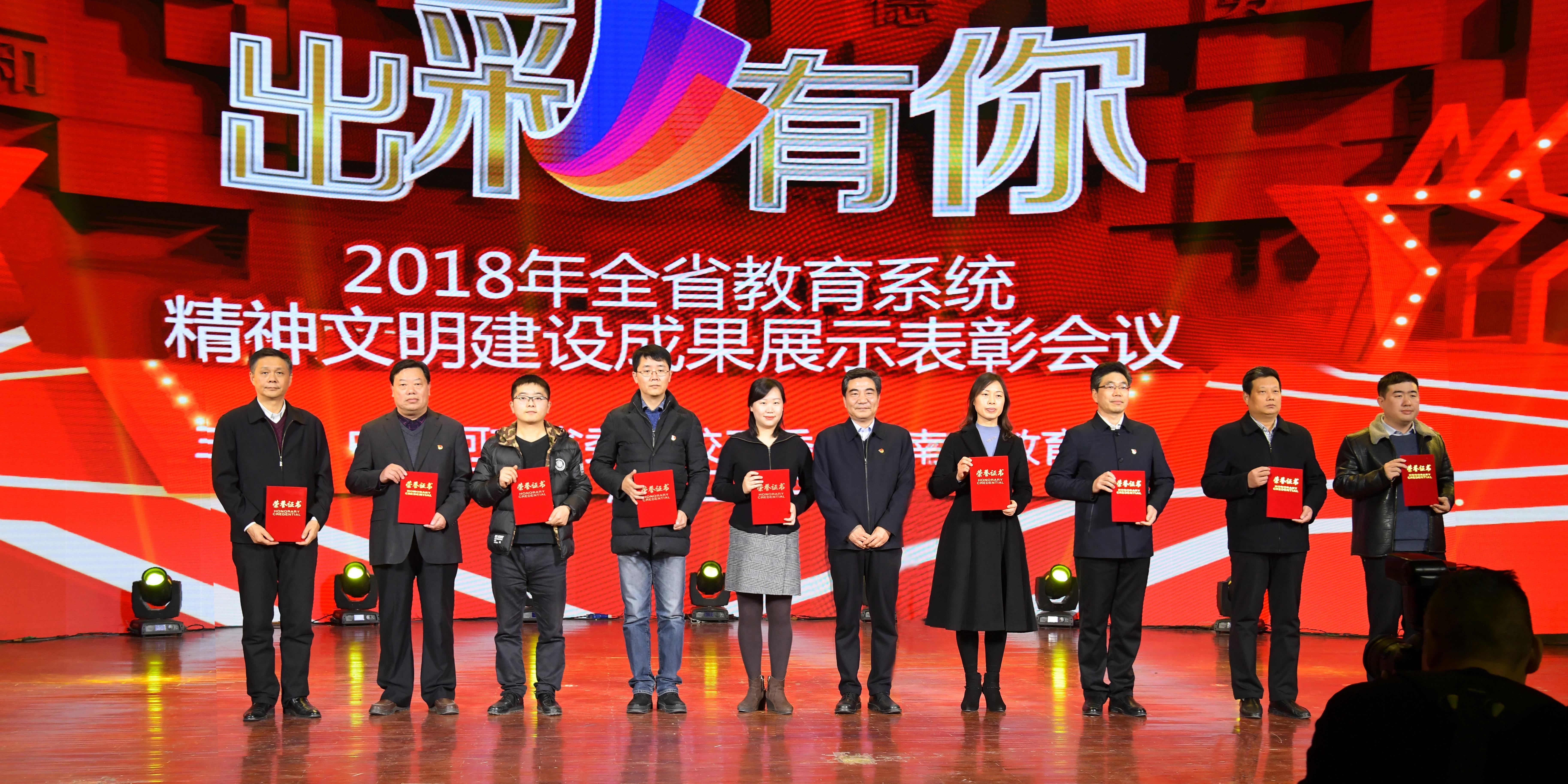 12月19日,由中共河南省委高校工委、河南省教育厅主办的2018年全省教育系统精神文明建设成果展示表彰会议在河南工程学院举行。省委高校工委专职委员陈垠亭出席会议并讲话;省委宣传部副部长尹书博,省文明办、省教育厅思政处相关领导出席会议。校党委书记苏东民参加表彰会,并作为河南省高职院校代表上台领取“两创两争”先进集体和先进个人荣誉证书。