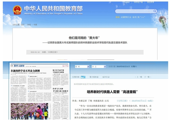 1月16日,教育部网站以“他们是河南的‘黄大年’——记荣获全国黄大年式教师团队的郑州铁路职业技术学院现代轨道交通技术团队”为题,3月31日,《光明日报》以“培养新时代铁路人需要‘高速重载’”为题,对我校现代轨道交通技术教师团队进行报道。