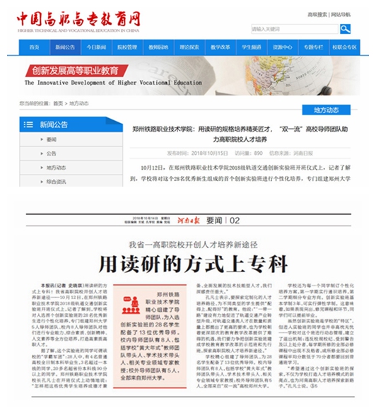 10月15日,中国高职高专教育网以“郑州铁路职业技术学院用读研的方式上专科!’双一流’高校导师团队助力高职院校人才培养”为题,10月14日,《河南日报》以“我省一高职院校开创人才培养新途径——用读研的方式上专科”为题报道我校成立2018级轨道交通创新实验班。 创新实验班28人中,有4名普通高校全日制本科毕业生,3名超过一本线的同学,20多名超省份本科线90分以上的同学。