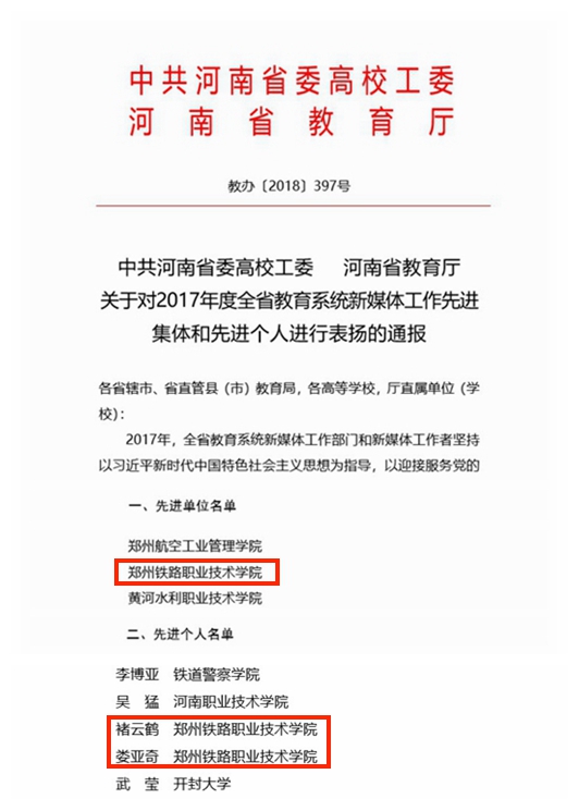 我校新媒体在中国青年报、现代职业教育网等媒体发布的高职院校新媒体周排行榜中多次名列全国第一,长期稳居全省第一,有力提升了学校的知名度、影响力和美誉度。中共河南省委高校工委、河南省教育厅印发《关于对2017年度全省教育系统新媒体工作先进集体和先进个人进行表扬的通报》,2人荣获全省教育系统新媒体工作先进个人,学校荣获全省教育系统新媒体工作先进集体。