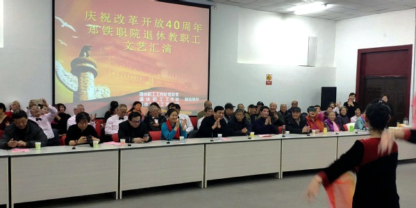 1月9日下午,“庆祝改革开放40周年”退休教职工文艺汇演在幸福路校区退休职工活动中心举行。党委副书记、纪委书记谢乾出席汇演,退休职工工作处负责人和全体退休教职工参加了文艺汇演。演出前,谢乾代表学校对支持学校发展的老领导、老教授以及全体退休教职工致以新年的问候和深情的祝福。