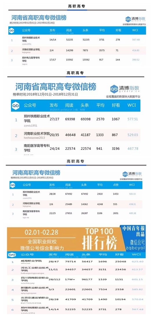 近日,由河南省教育厅发布的全省高职高专2月份微信公众号榜单出炉,我校官方微信继续保持全省第一。在中国青年报发布的全国职业院校微信公众号2月份排行榜中,我校官方微信位列全国第六。