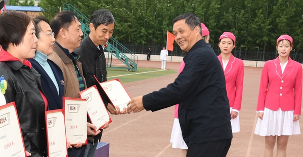 在欢快的音乐声中,校领导为各获奖单位和代表队颁发证书和奖杯。