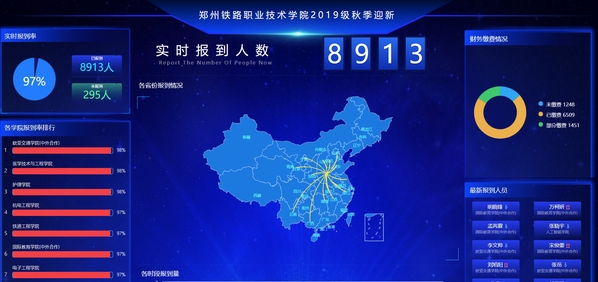 “智慧化迎新,让服务更贴心。”2019级新生录取后,在家即可提前缴纳费用,通过“今日校园”手机APP查询个人信息、智能自主选宿、预定军训服等。现场报到阶段,电子大屏实时显示更新全校报到人数、各学院报到情况、实时报到人员、各省份报到情况、各时段报道情况及财务缴费情况等数据,并对新生报到相关数据进行实时分析和更新。新生除了用手机完成报到外,还可以轻松提前查阅入校须知等各类信息;从校领导到各级管理人员也能通过移动端随时掌握迎新进度、办理迎新业务。