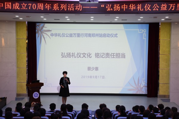 启动仪式上,谢乾在致辞中表示,中华民族在几千年的历史中创造了灿烂的文化,形成了高尚的道德准则、完整的礼仪规范和优秀的传统美德。传承和弘扬中华优秀礼仪文化,是教育的责任和使命,希望以中华礼仪万里行活动为契机,多种形式、多种载体,不断加强和改进中华优秀礼仪和职业礼仪教育,并寄语广大同学们学礼、明礼、守礼、弘礼,养成良好的行为习惯和个人素质,涵养温文尔雅、恭谦礼让的品质风范,以行践言、以礼致远,共同建设文明之校园、和谐之社会、礼仪之国家。蔡少惠主任宣读了“中华礼仪公益万里行倡议书”,并进行了宣誓和授旗仪式,我校成为中华礼仪公益万里行的郑州站牵头院校。蔡少惠号召青年学生身体力行、率先垂范,争做中华文明礼仪的践行者;修身立德、风正行远,争做中华文明礼仪的传播者;心怀大爱、勇于担当,争做中华文明礼仪的引领者。